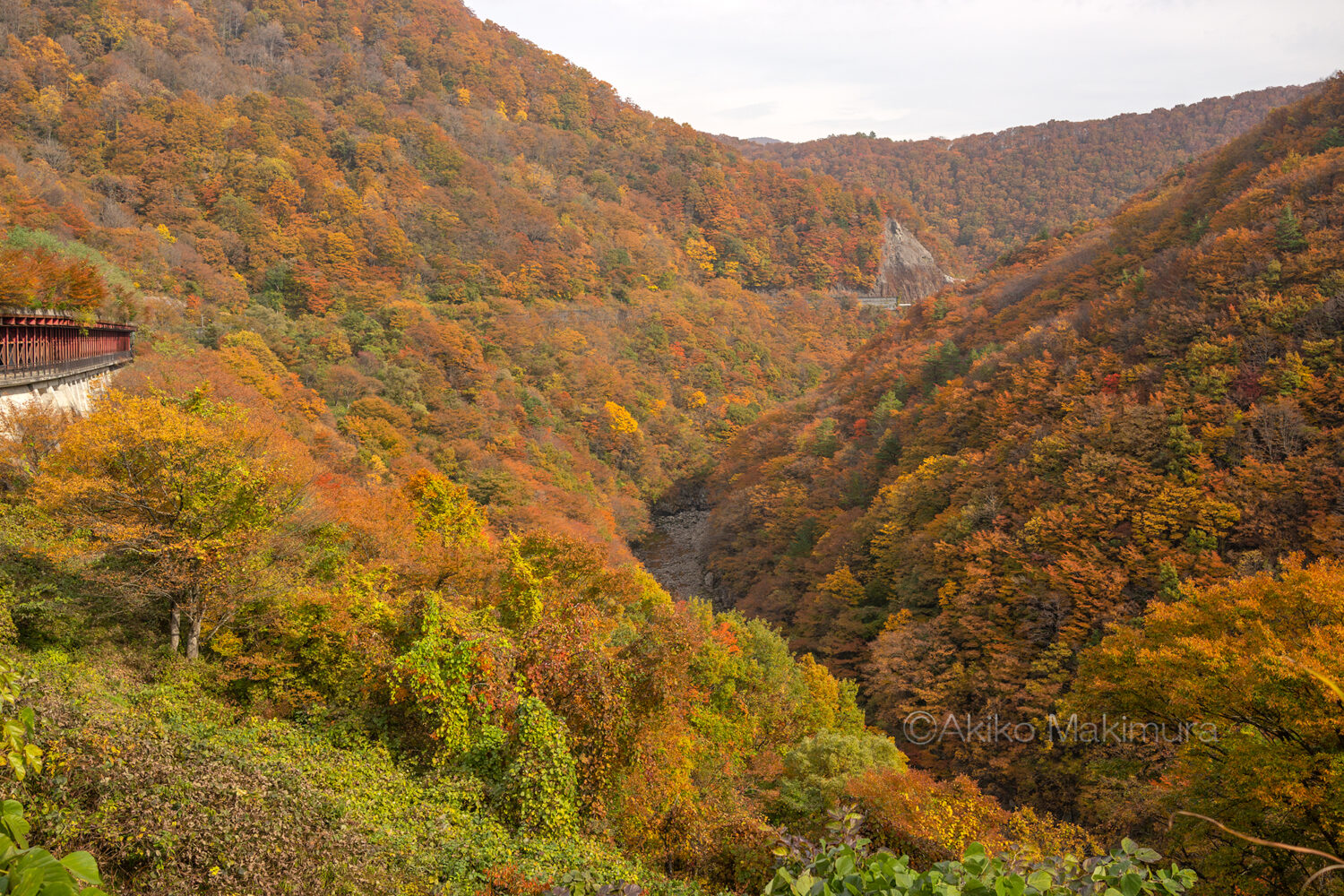 いま通ってきた国道がある方向を振り返る。赤いスノーシェッドに続いて道があるはずだが、オレンジに染まった山の中に埋もれている。