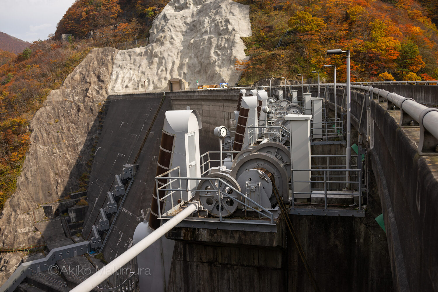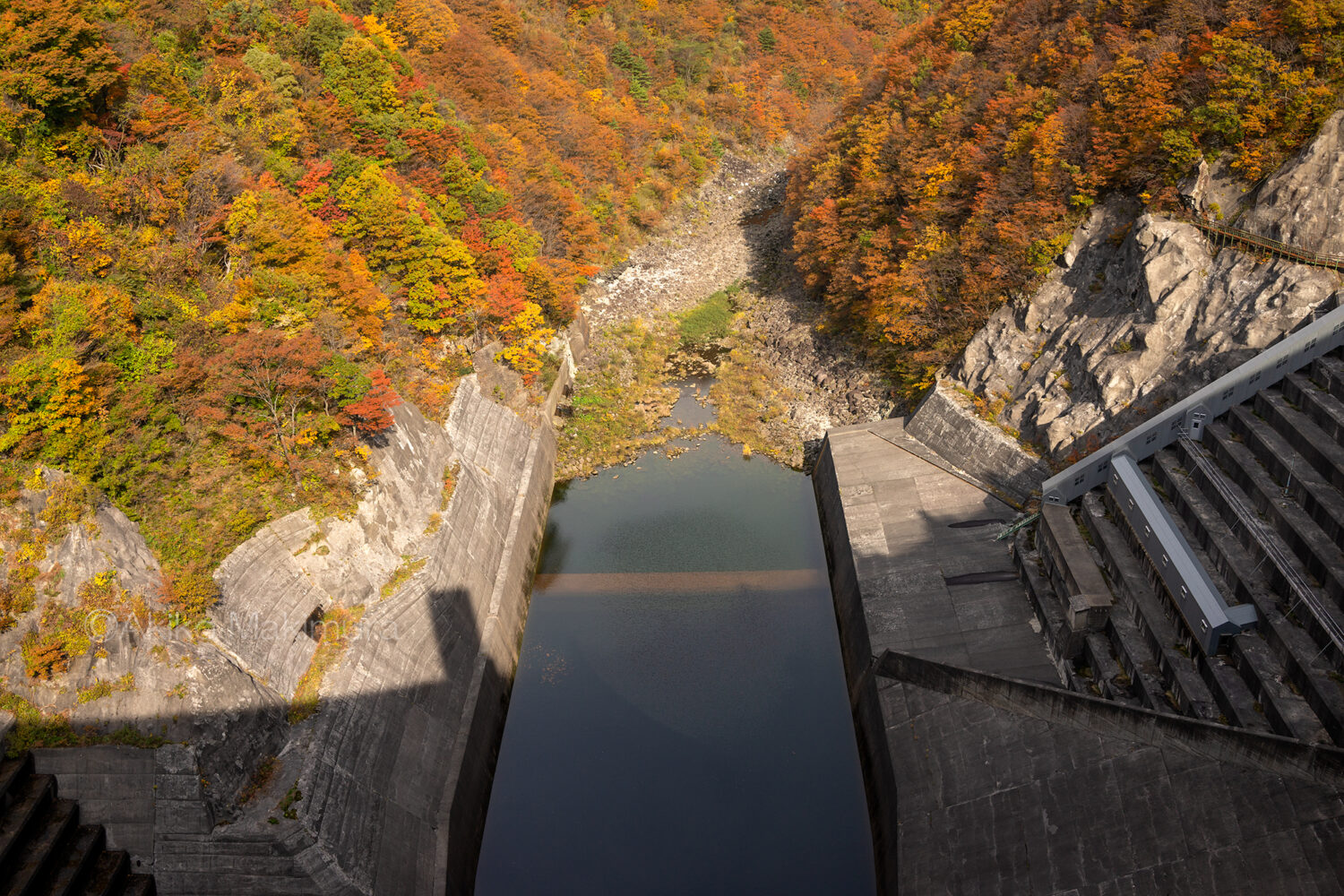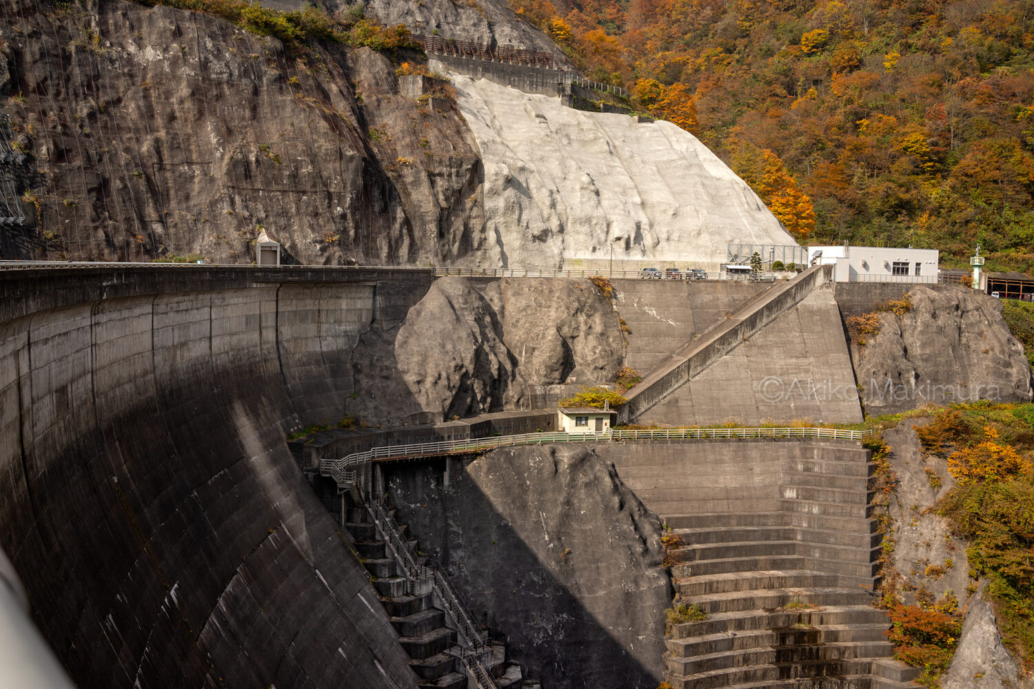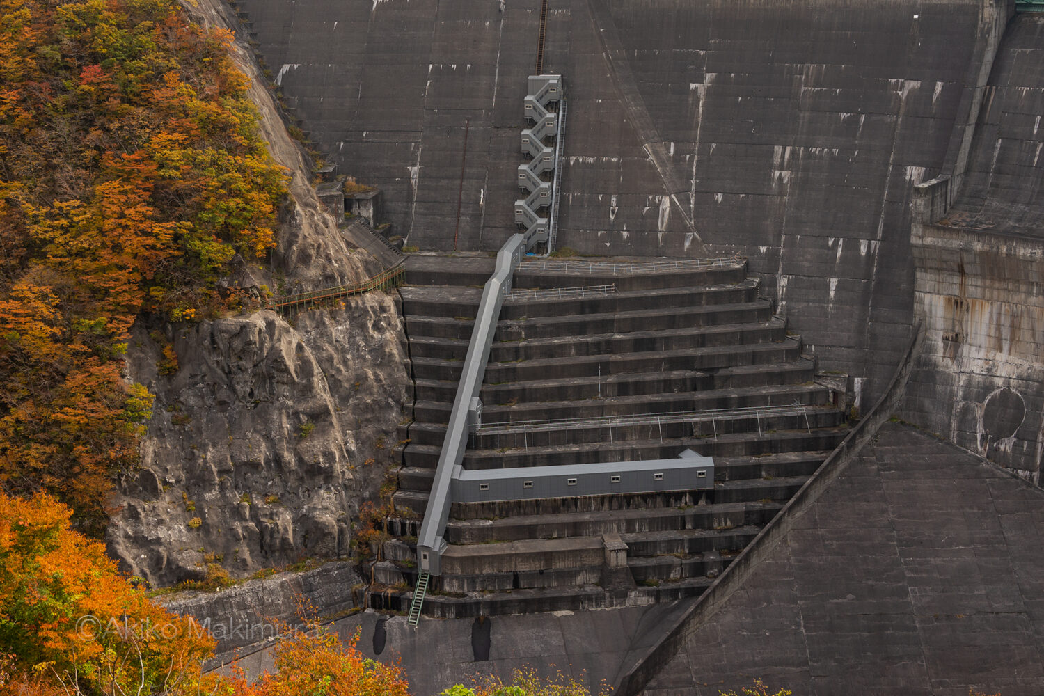ゆるやかに左にカーブする天端を歩く。正面の山が燃えるようだな・・と思いつつ、ダムの外側をのぞき込む。