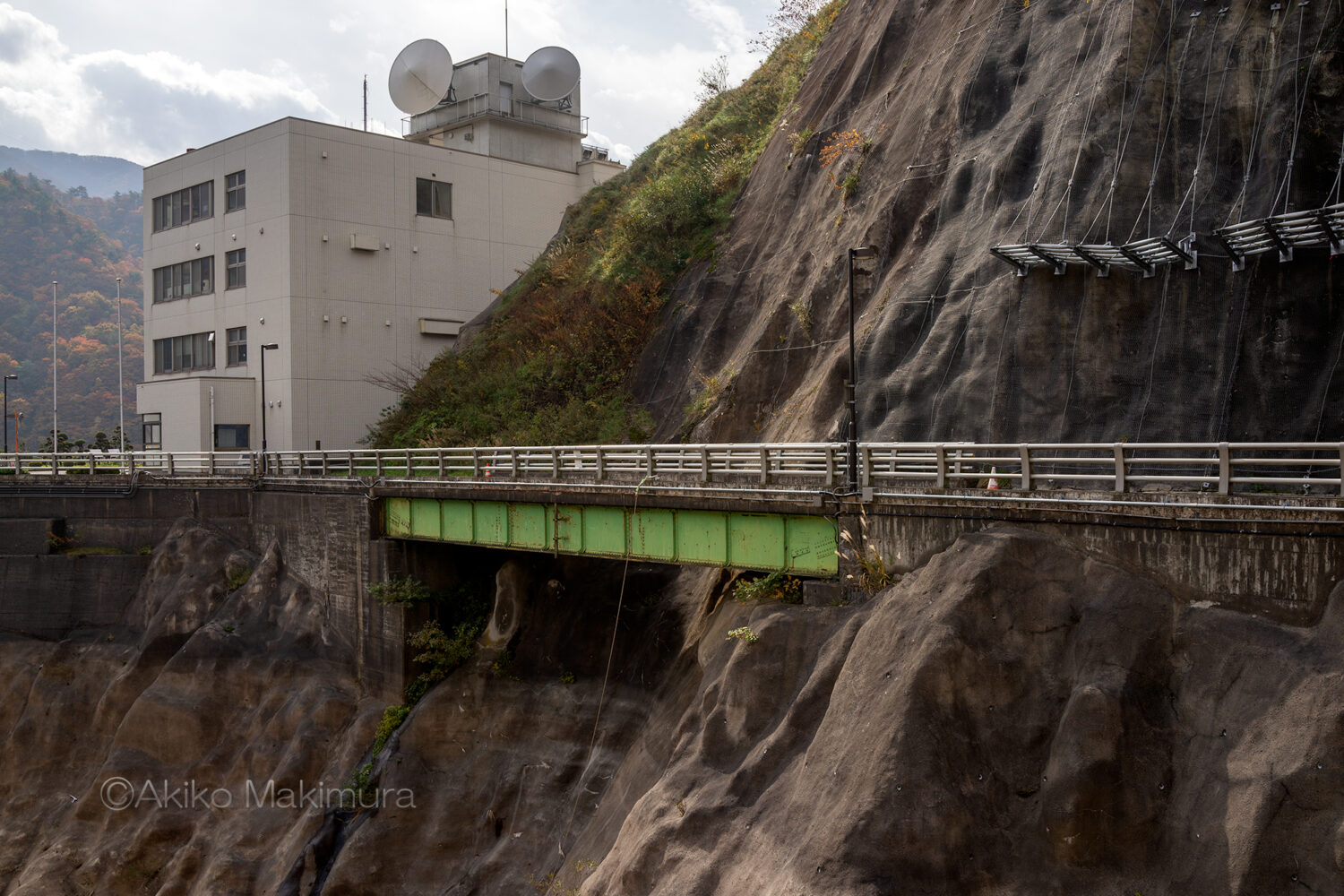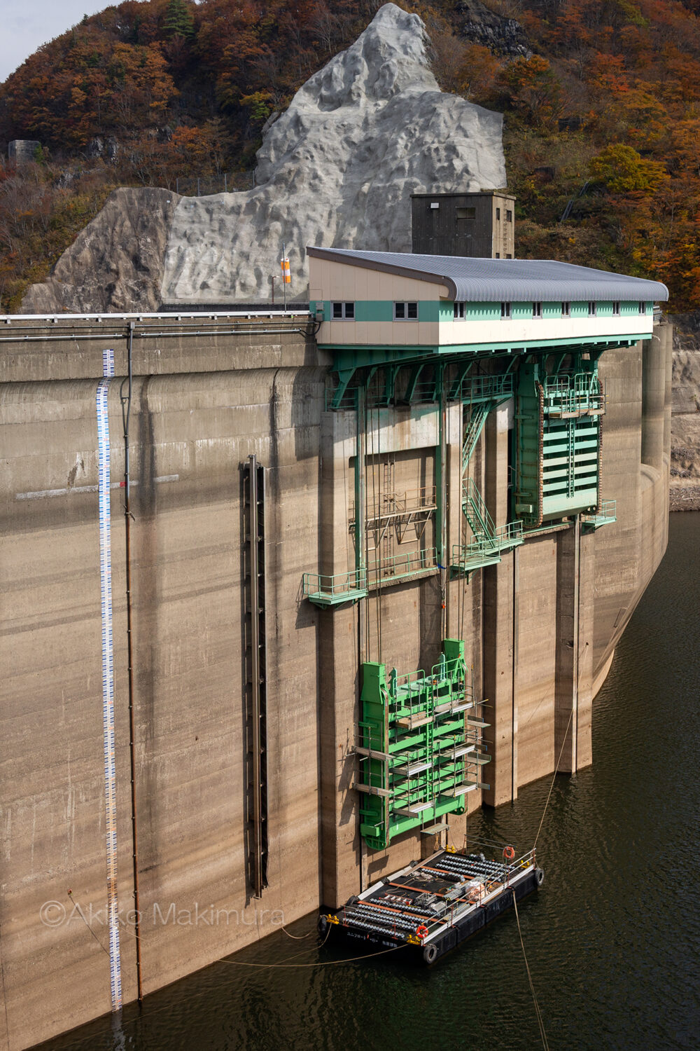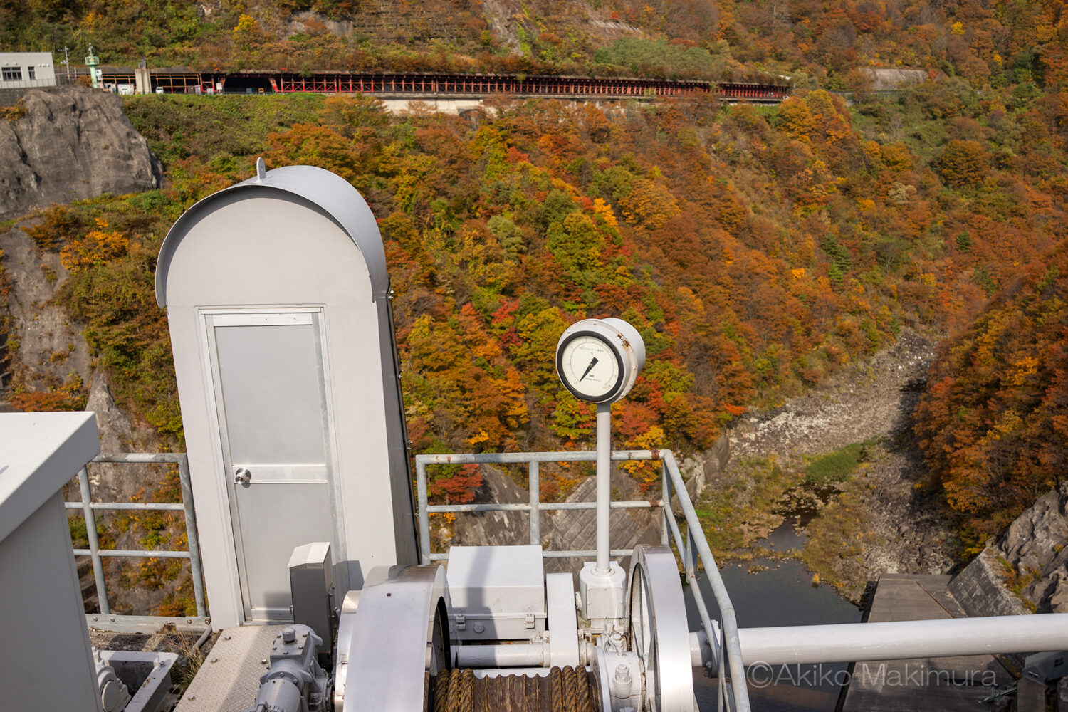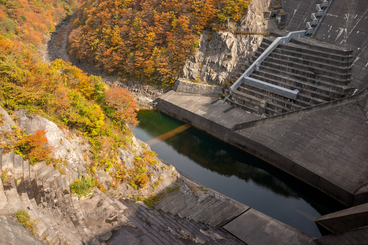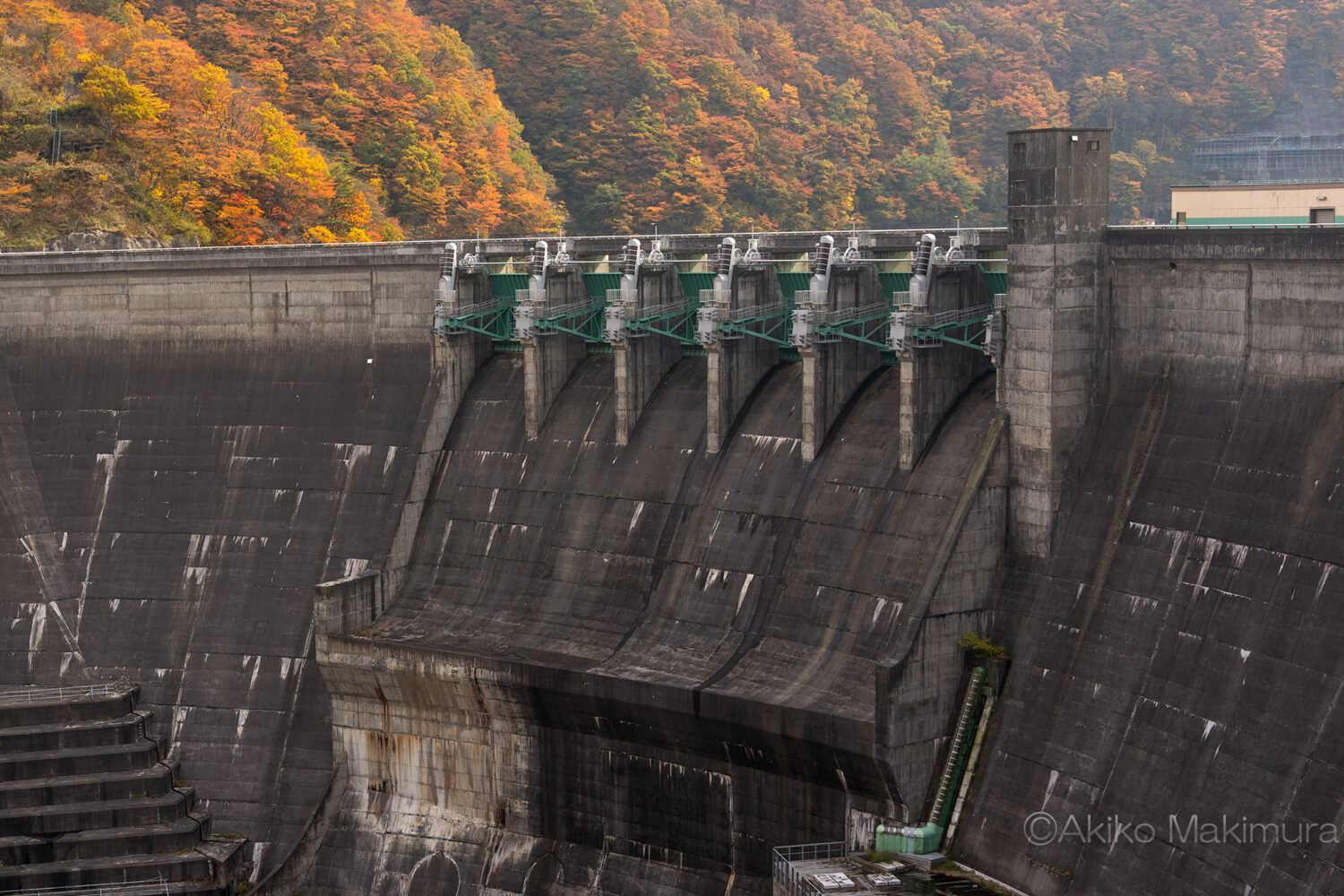 ゆるやかに左にカーブする天端を歩く。正面の山が燃えるようだな・・と思いつつ、ダムの外側をのぞき込む。