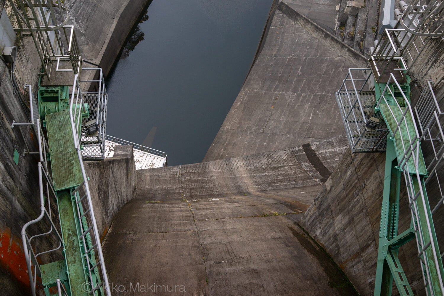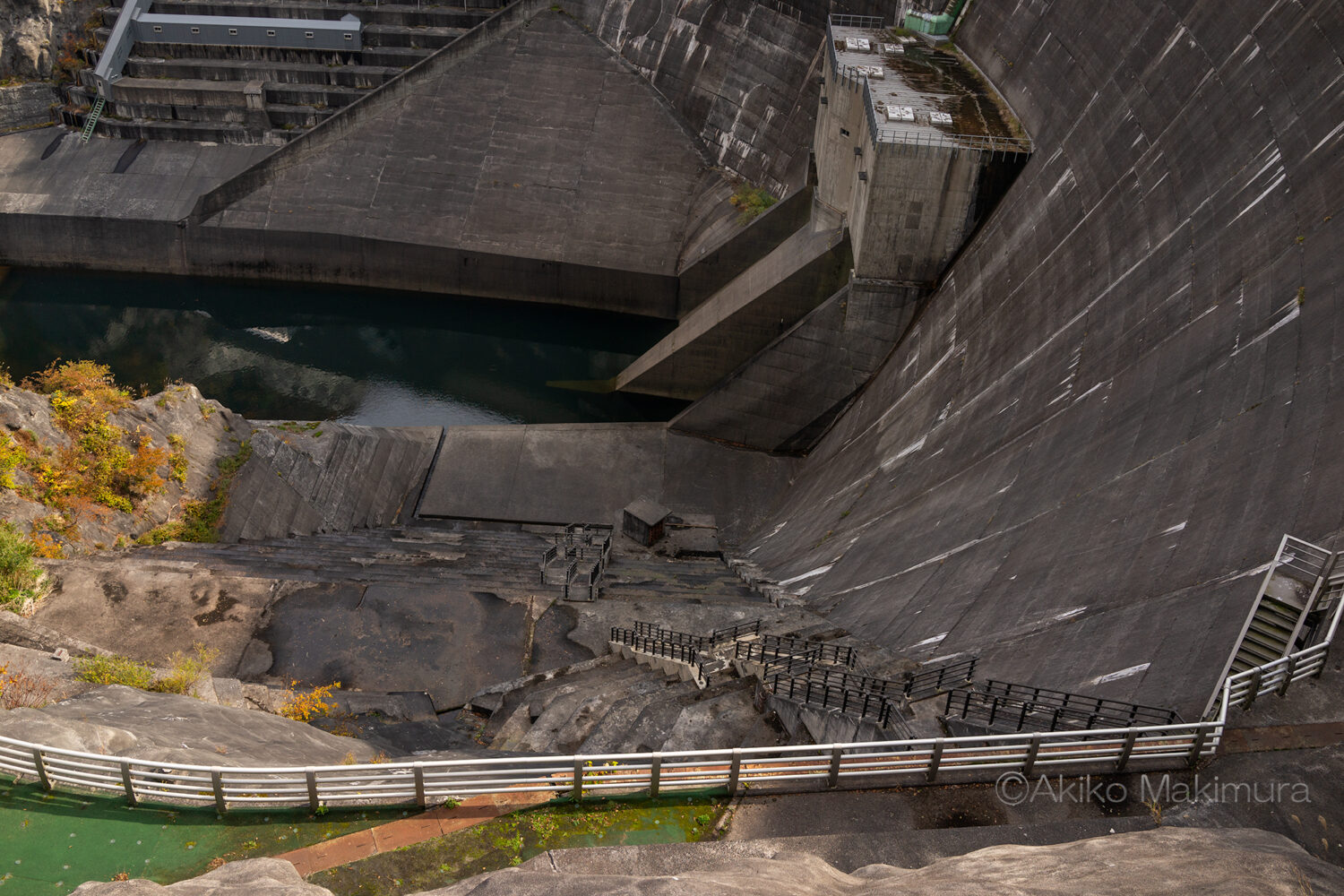 ダムの下方をのぞき込むと、途中まで降りていけそうな階段がある。が、もちろん職員用なので一般は立ち入れない。