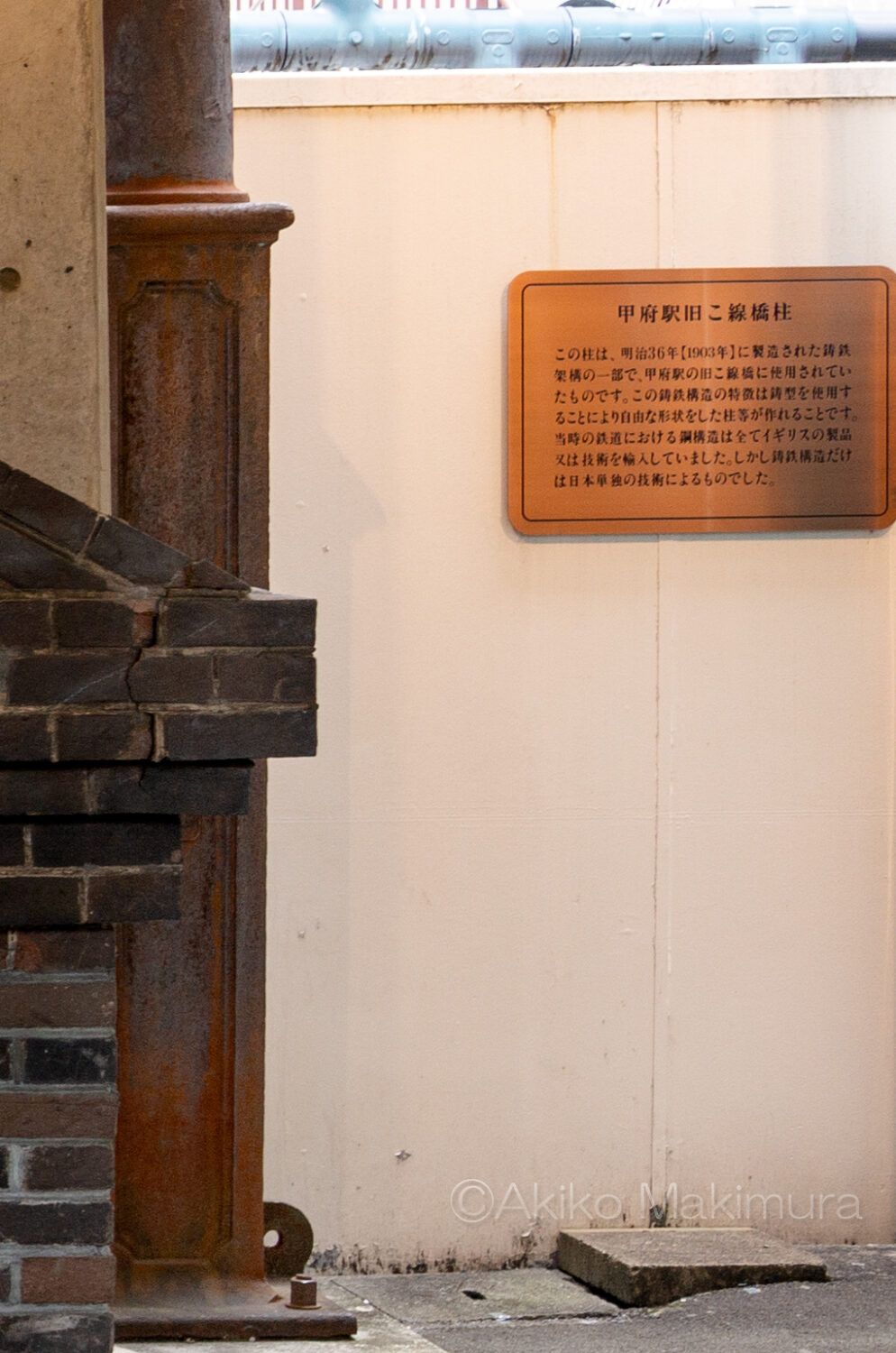 なお、愛知県の木曽川駅にも、跨線橋の柱がモニュメントとして設置されている。製造時期は甲府駅より後のようだが、デザイン的によく似ている。