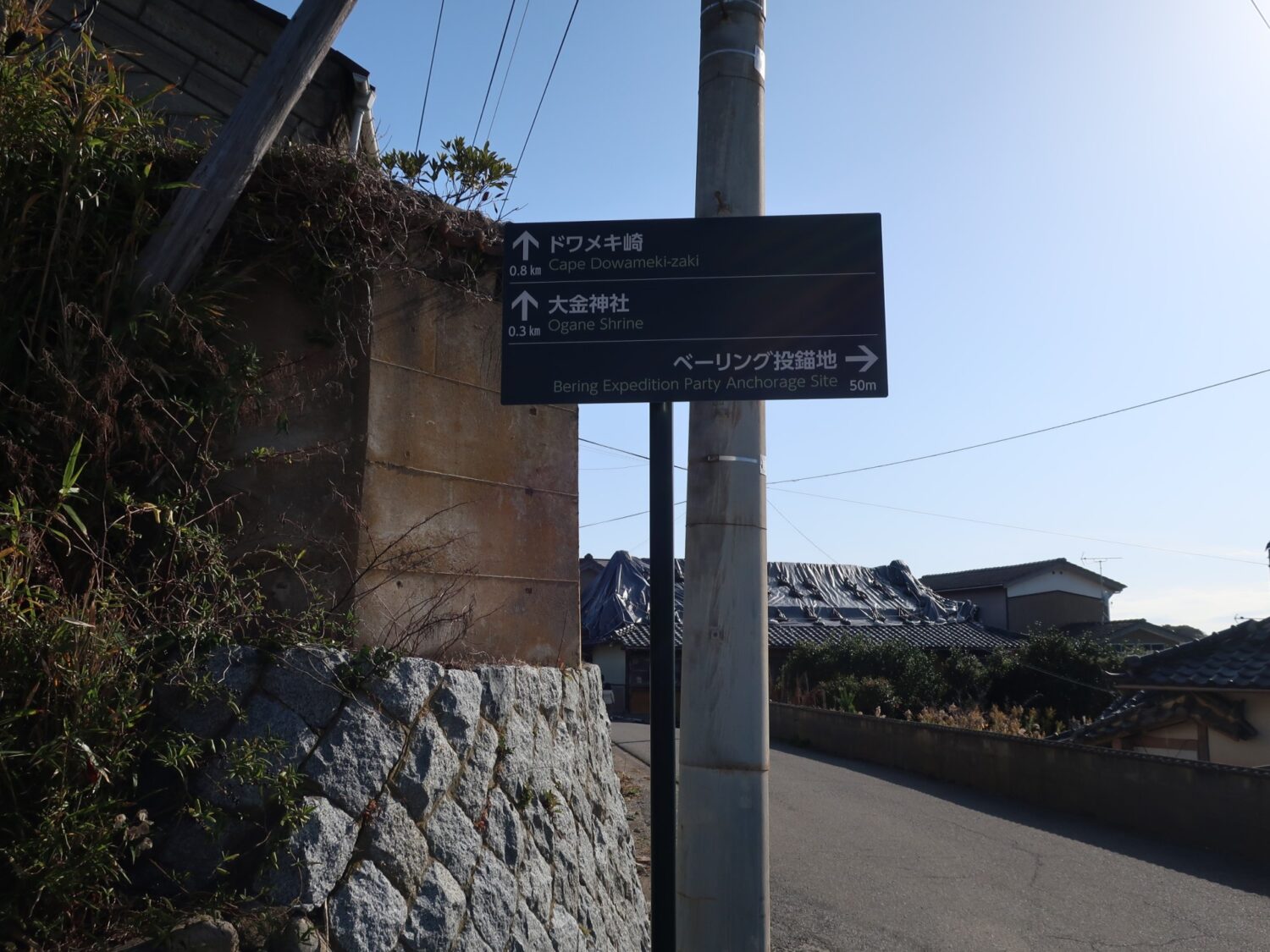 ここでの表記は「ドワメキ崎」。右の「ベーリング投錨地」は、ベーリング海峡などの名前のもととなった、ロシア人ヴィトゥス・ベーリングの探検隊が投錨したところだという。が、寄り道せずに直進。