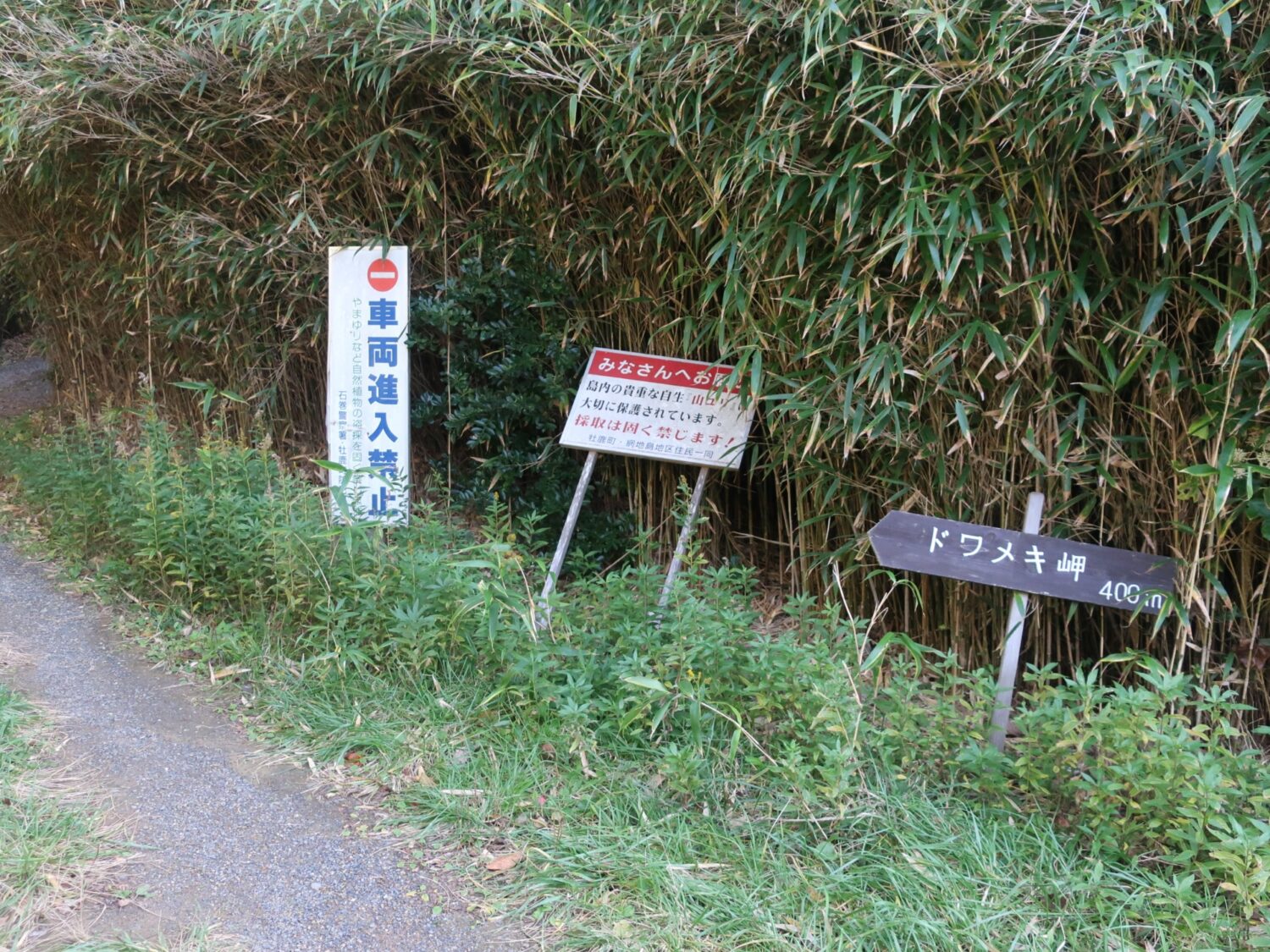 わだちがあるので間違いようはないと思うが、親切に案内板。ここでは「ドワメキ岬」だ。付近はヤマユリが生えているらしく、採取禁止の看板もある。
