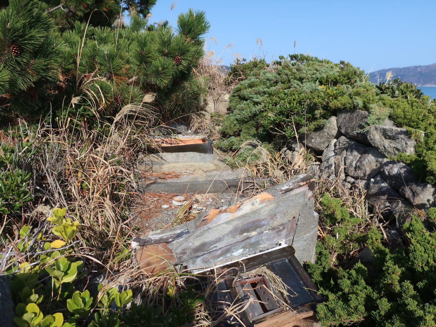 足元には、土台からはがれ落ちた祠(ほこら)と思われるものもあった。風雨だけでこのようにはなりにくそうだ。地震で倒れたのか。この高さまで津波が来たとは思えないのだが。