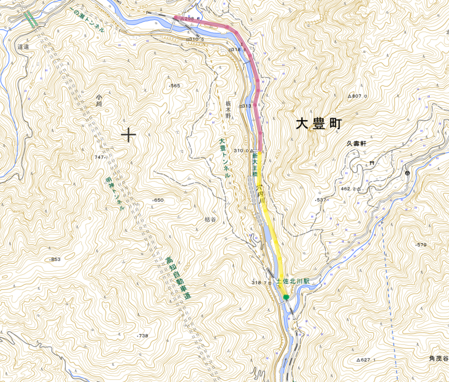 もう少し駅周辺を拡大してみてみよう。国土地理院の等高線表示の地図で見ると、険しい山間部を穴内川と国道と土讃線が押し合うように並走していることがよくわかる。