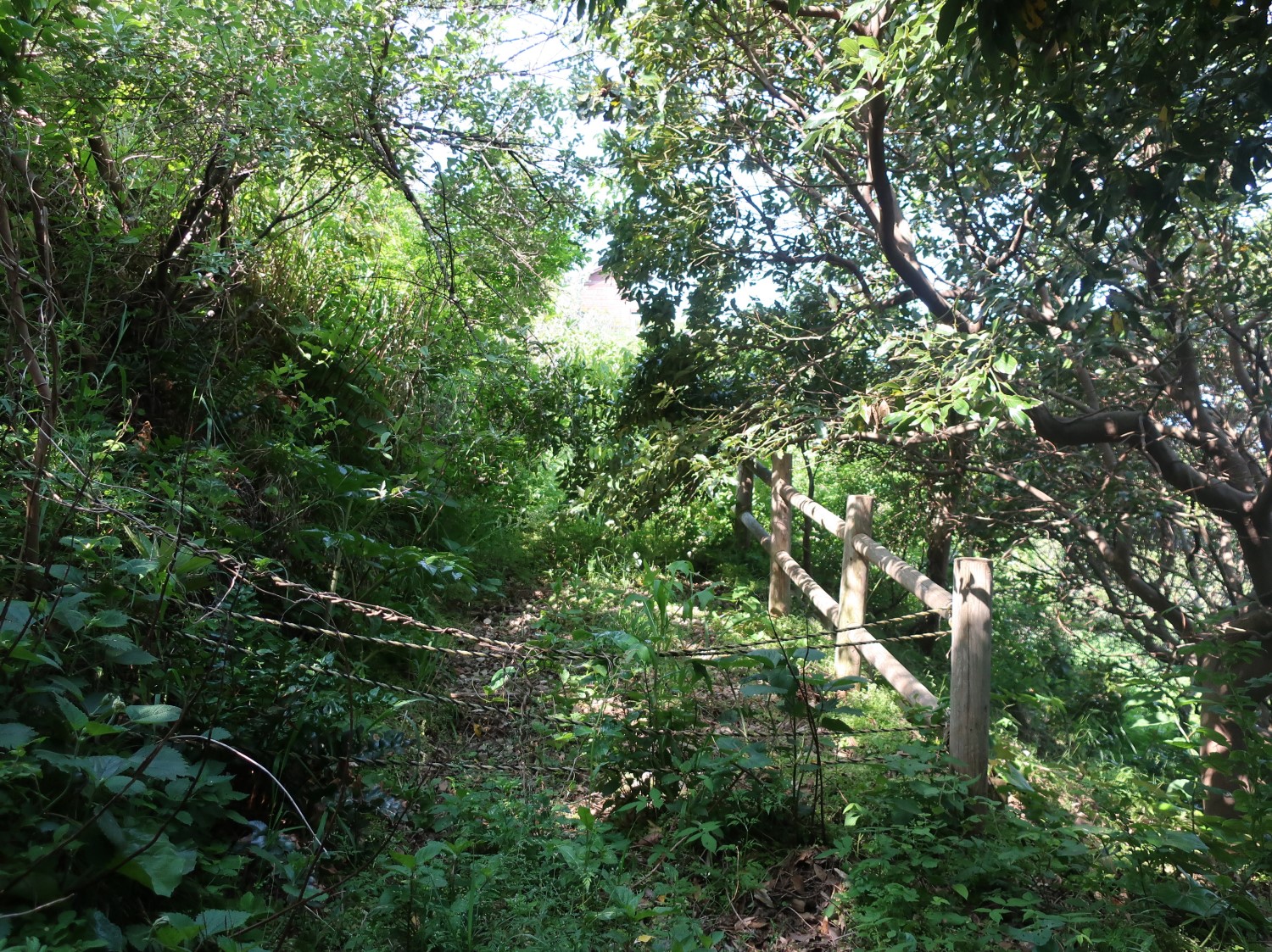 そして、後ろを振り返ると、ロープで入れないようにしている遊歩道があった。そもそも草木に飲み込まれて物理的にも入れない。