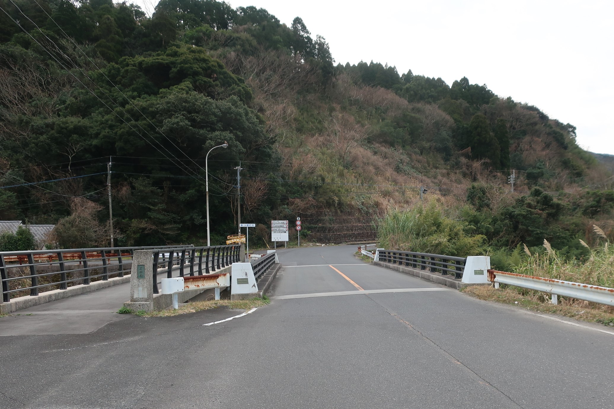 国道448号を内之浦観測所の方に向かい、内之浦の街中を過ぎたところに広瀬橋があり、橋をわたってから左に曲がる。火埼灯台の小さい案内板がある(写真中央やや左、歩道の欄干付近)。