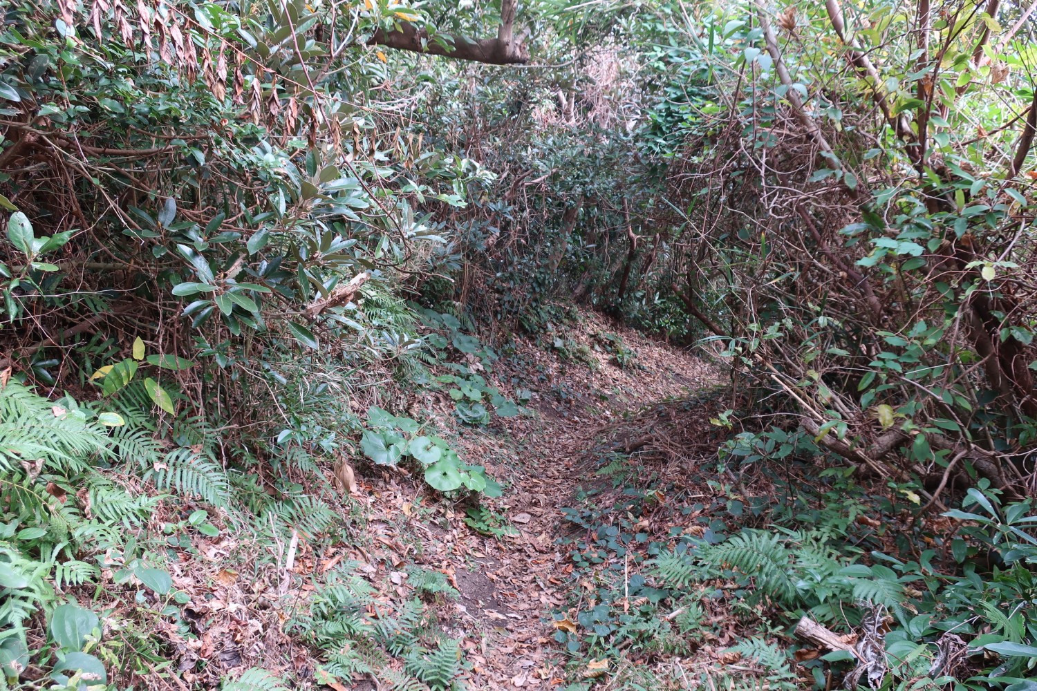 今来た方向を振り返ると、灯台へと下っていく徒歩の道がある。