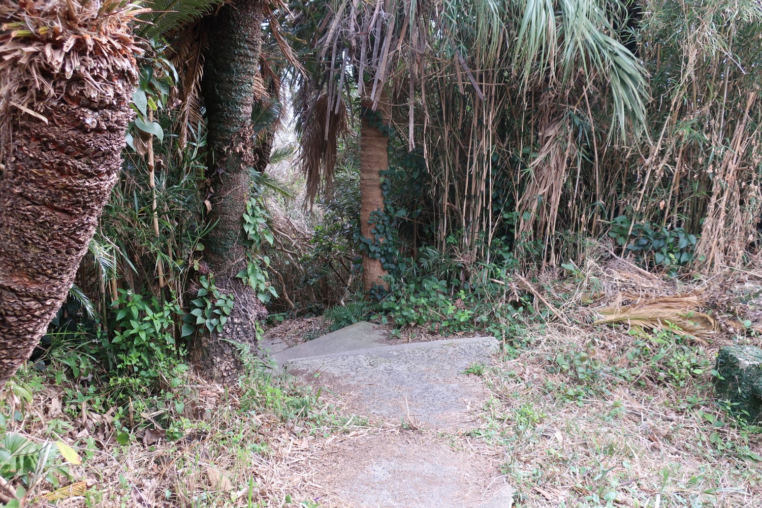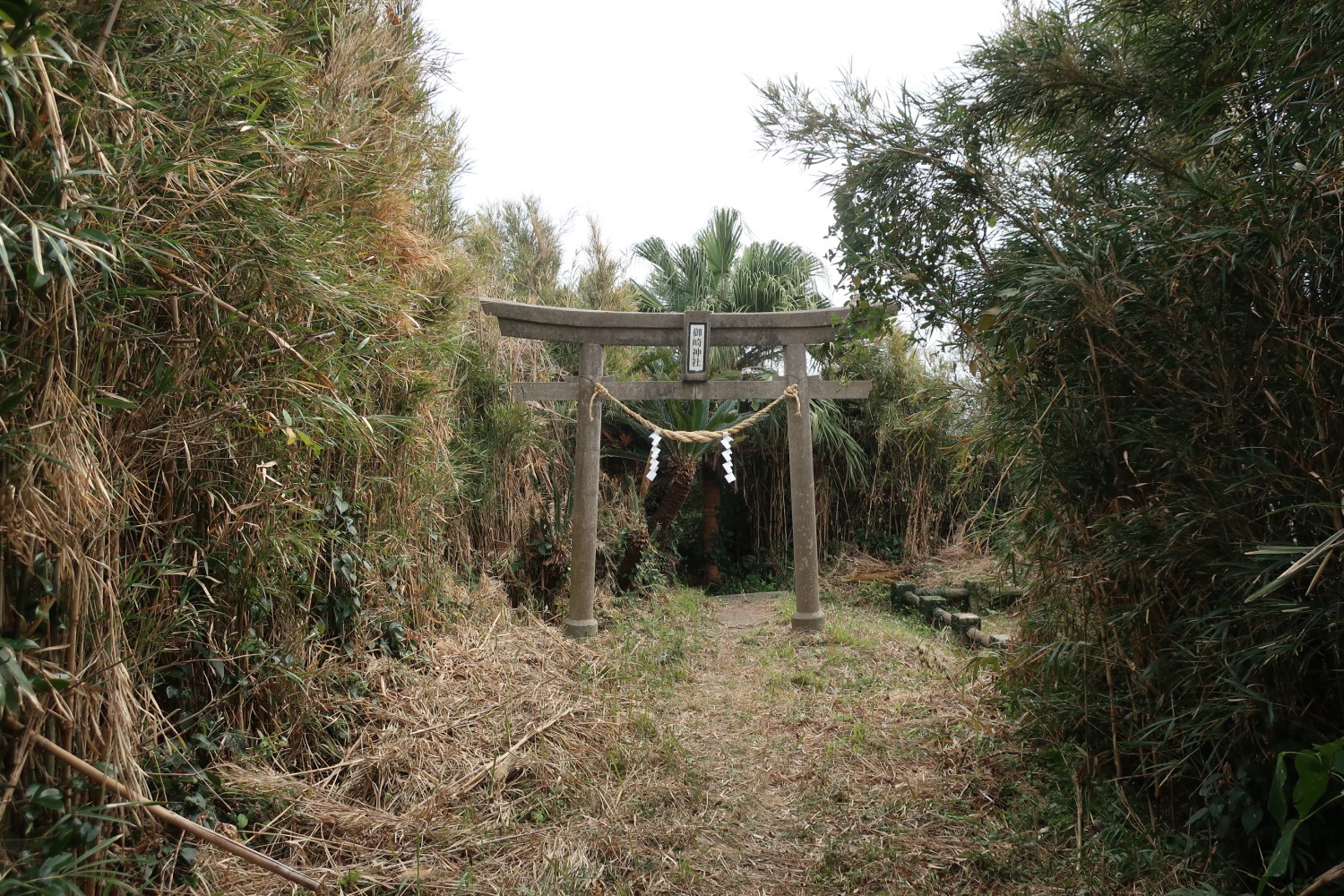 鳥居の先には下っていく階段がある。少し先に社(やしろ)があるらしい。さらに先に分け入ると、岩場の海岸に出るようなので、そこで釣りをする人がいるのかもしれないな。