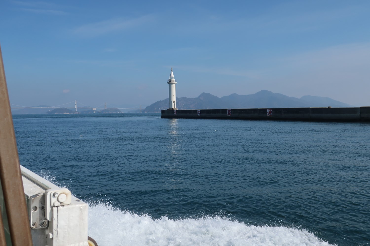 船が今治港を出るときに、三角帽子の今治港東防波堤灯台が見えてくる。