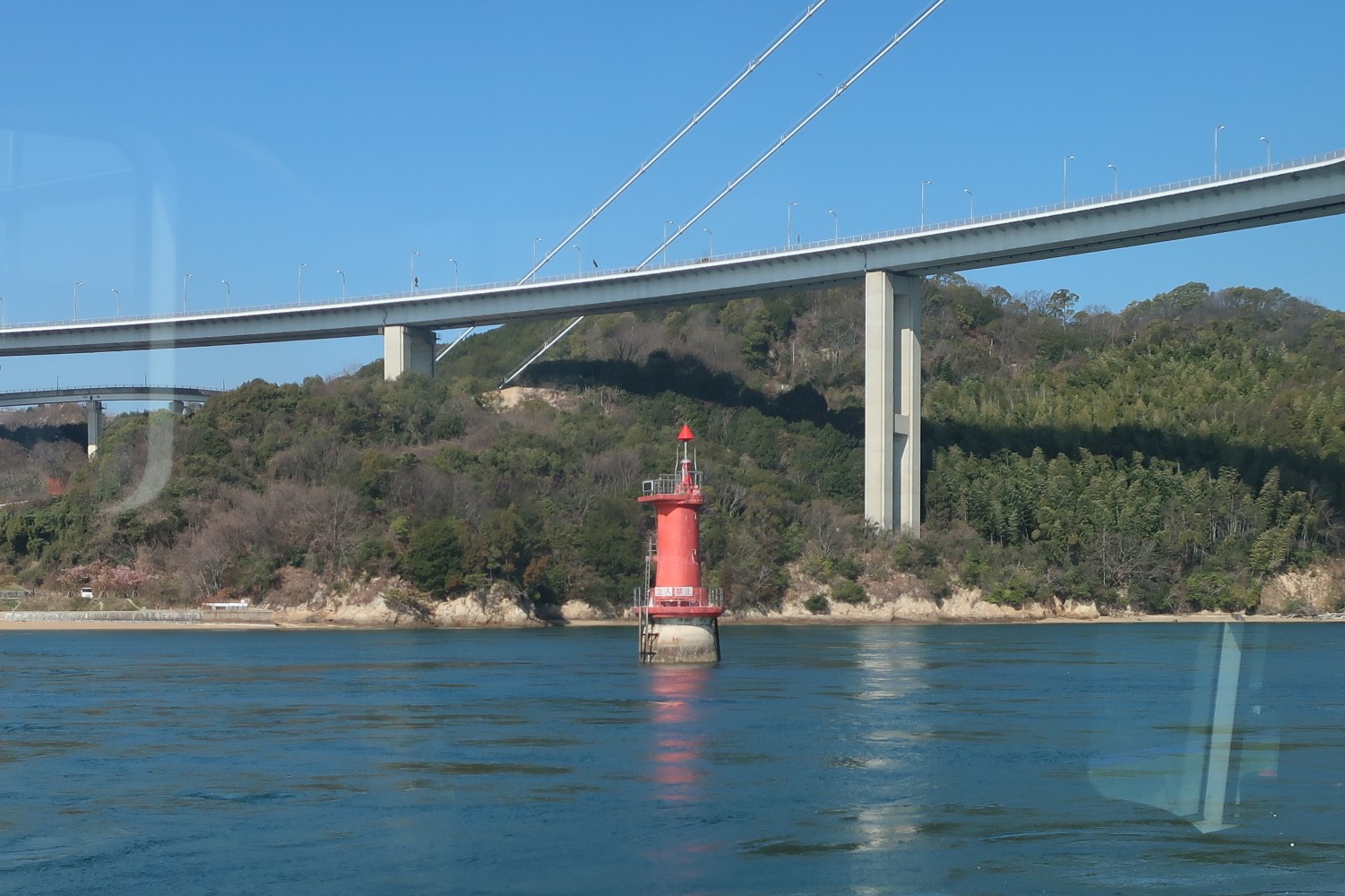 すぐその先に来島海士瀬(くるしまあませ)灯標がある。上を通っているのはしまなみ海道。