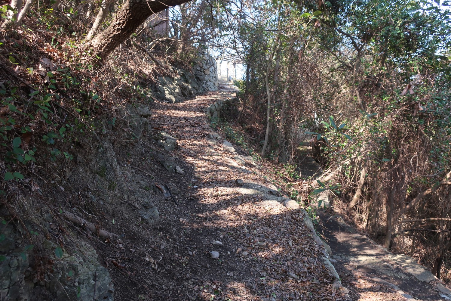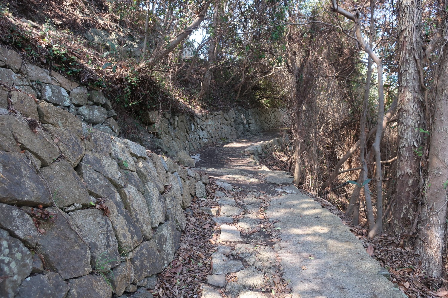 みごとな石垣が組まれている。灯台建設時からあったのかどうかはわからない。直進か左折かを迷うが、結果的にはどっちでも同じだ。