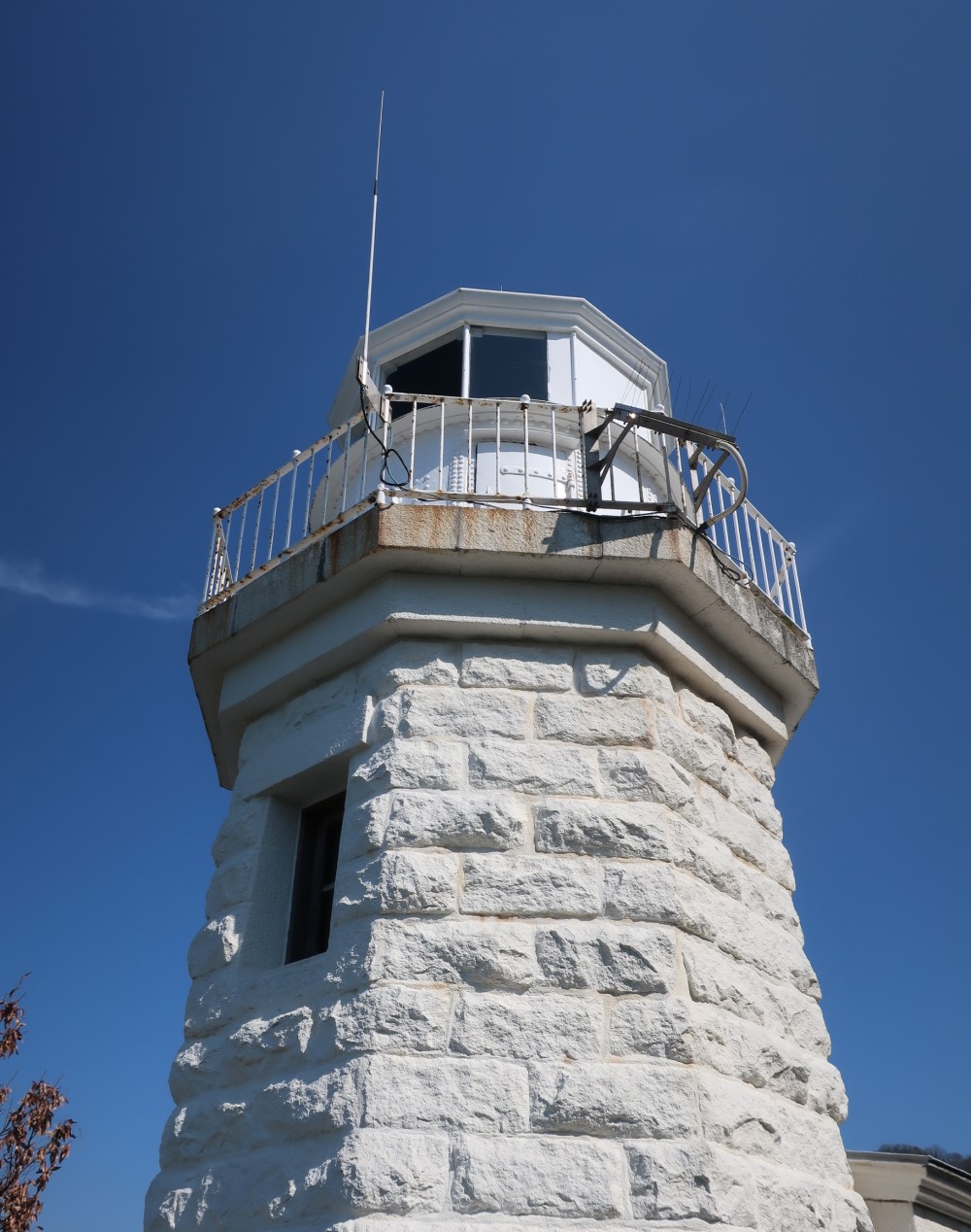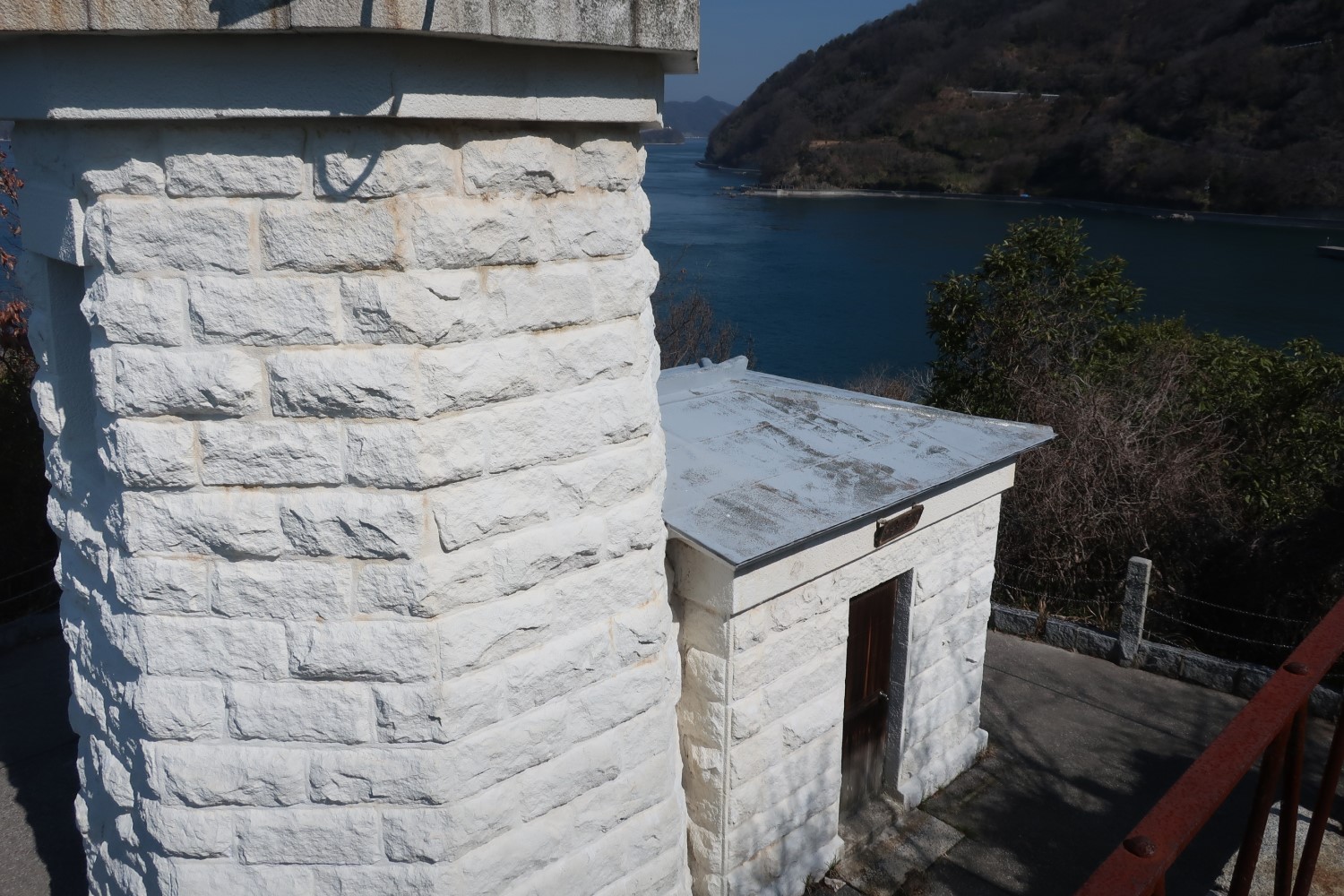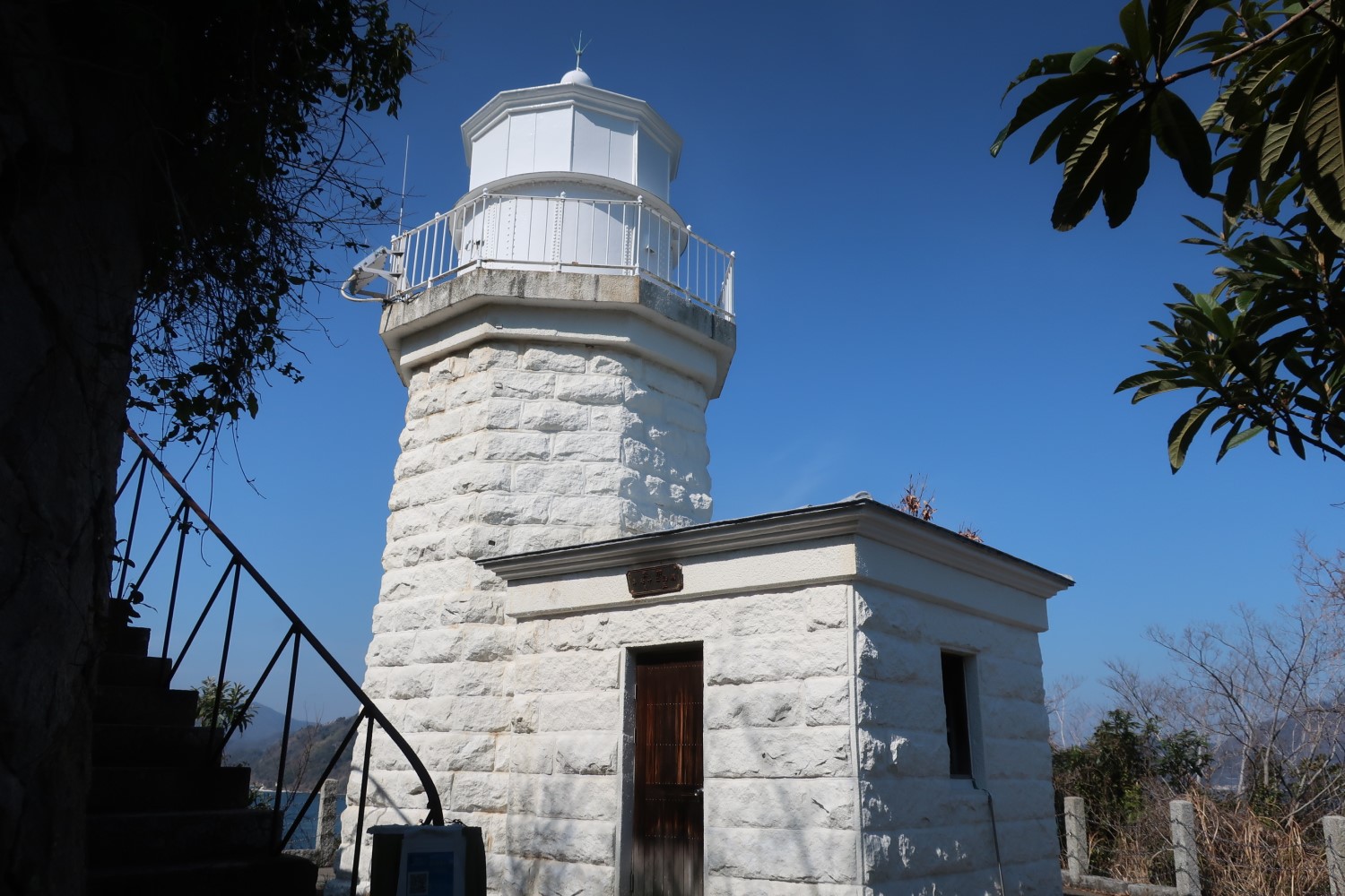 その広場から見た姿が、大下島灯台のベストショットだろう。もう少し左に寄る光源(LEDだった)がちょっと見える。ほかの灯台は塔頂が半球(ドーム)型だが、ここはほかと少し違う。