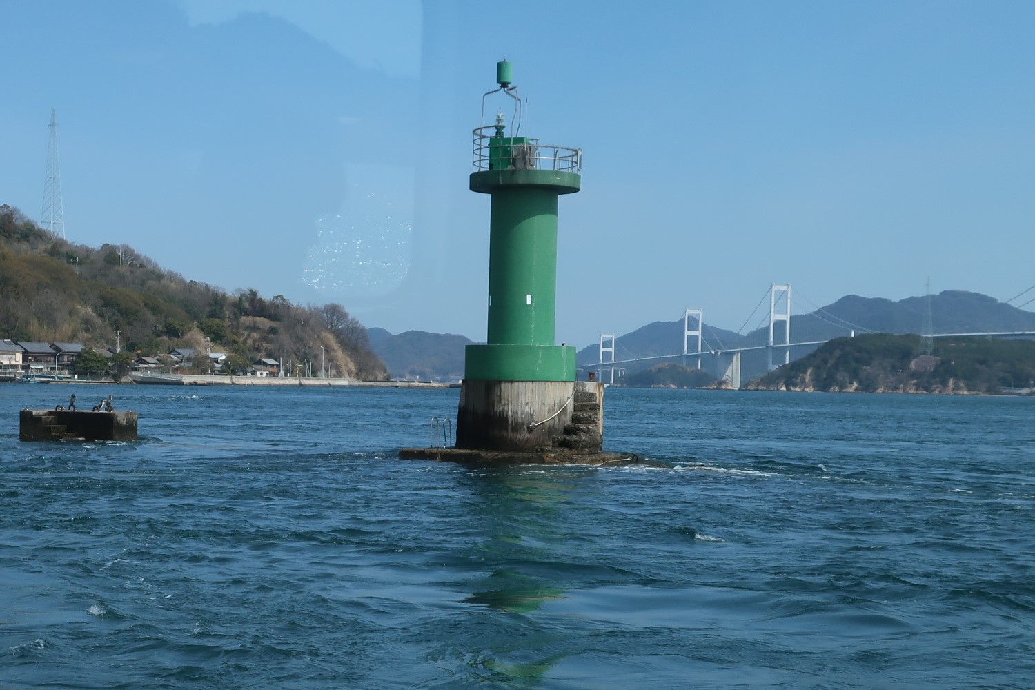 しまなみ海道をくぐったあと、右舷に現れるのが来島中磯灯標だ(帰路に撮影)。来島(くるしま)と小島(おしま)に挟まれた狭い水路の真ん中に立っていて、強い潮流が土台に打ち付けているのがわかる。