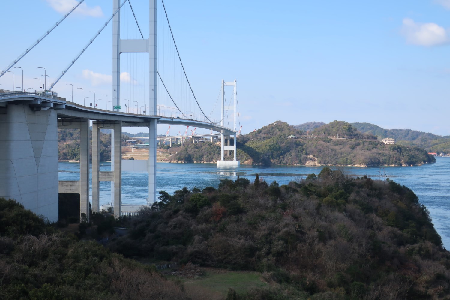 しまなみ海道がよく見える。橋の向こうが今治側、左端に馬島バスストップがある。