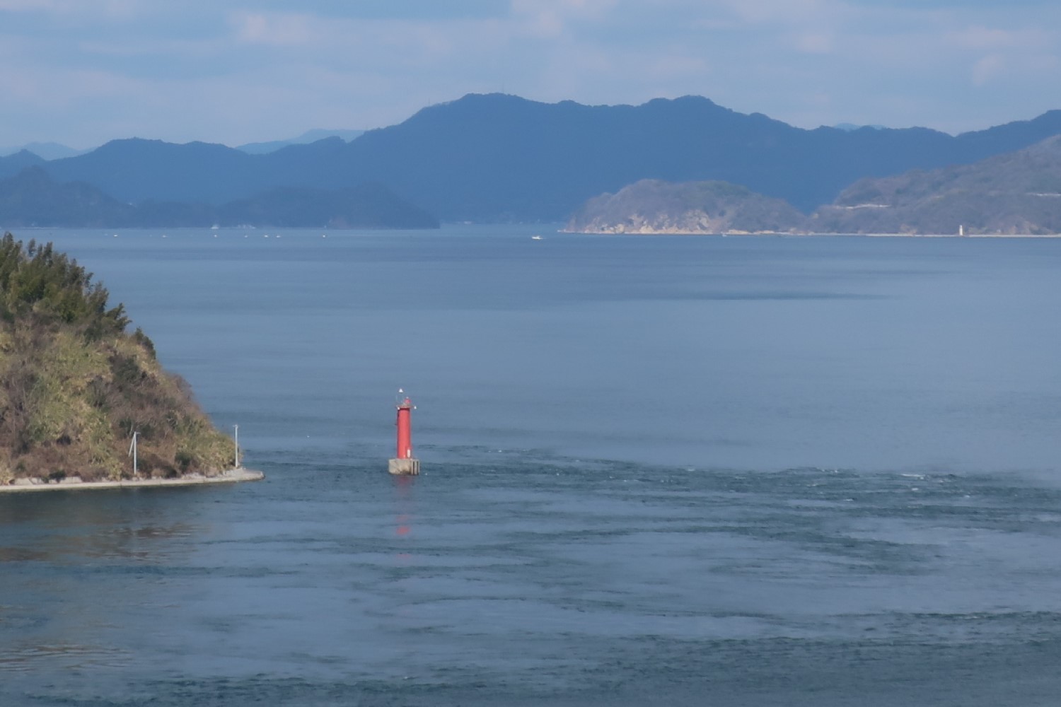 小島のすぐそばに、赤い小島東灯標が見える。また、写真右端近く、大下島の海岸近くにアゴノ鼻灯台が小さく写っている。現場では気づかなかったが。