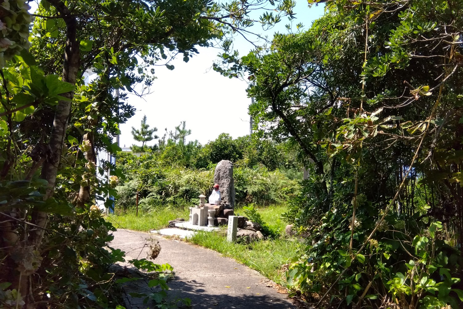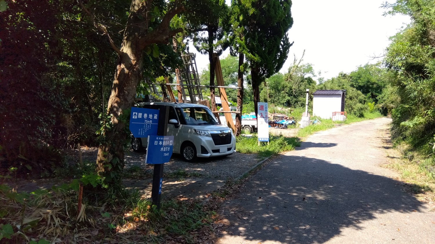 「地蔵前」というふしぎな名前の民宿を過ぎると、「腰巻地蔵 75m先」という案内板があるので、クルマを止め、その小道を左に入る。