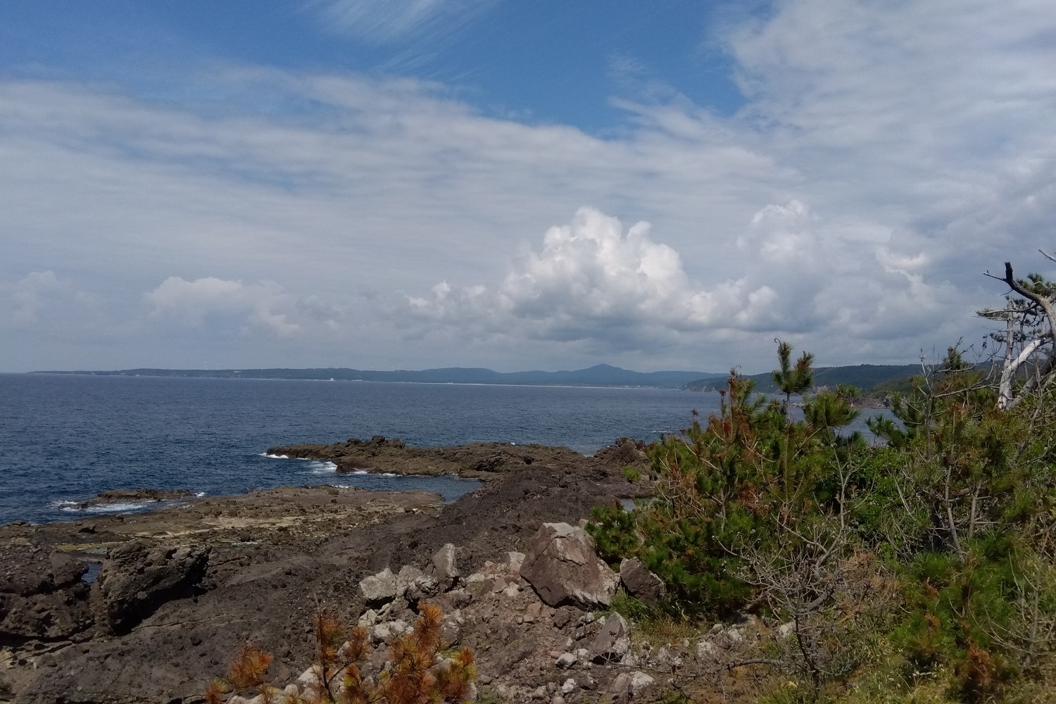 背後の海はこんな感じ。この付近の海岸線は、溶岩性の岩石が複雑な形をしていて、海岸近くの船の航行にはたしかに注意が必要かもしれない。