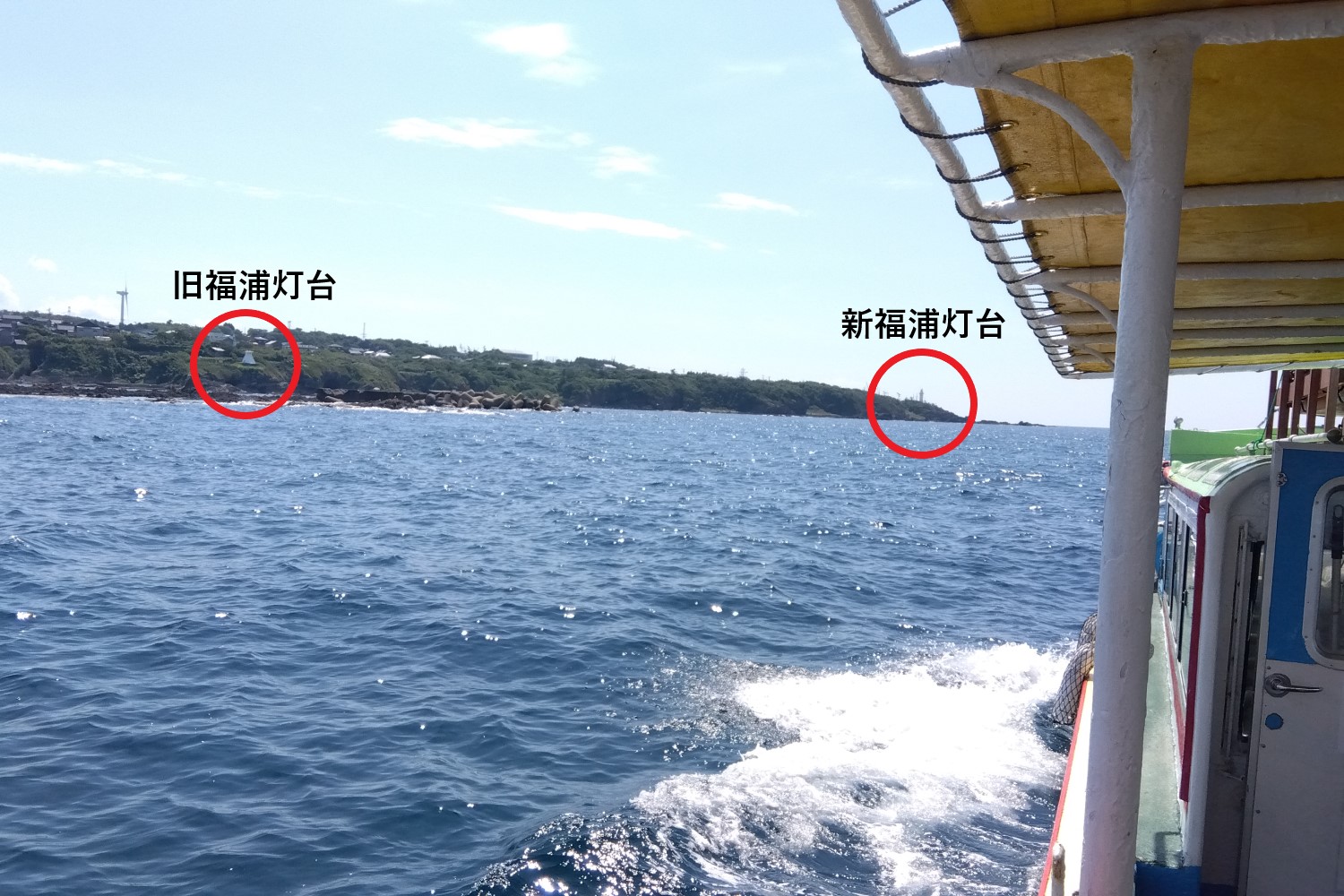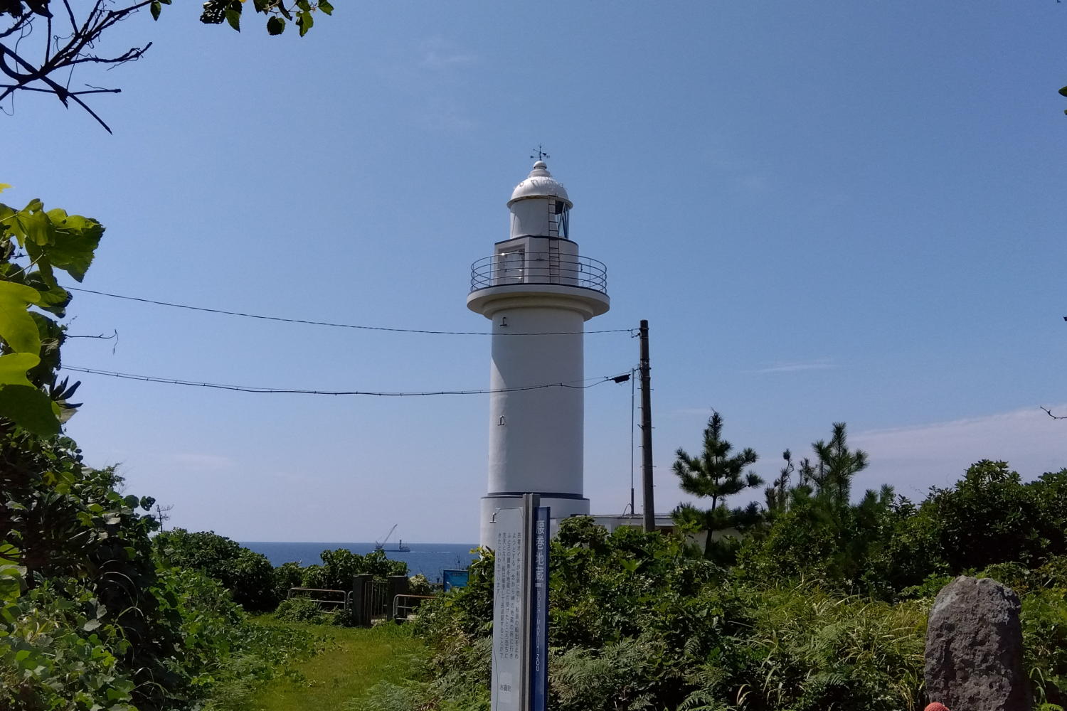 写真よりもう少し左に福浦港(ふくらこう)がある。旧福浦灯台は福浦港に出入りする船のために作られたが、新福浦灯台はもう少し広い海域を照らす、ということだろうか。新灯台は旧灯台とは離れた場所に建てられた。このために旧灯台が残され、「日本最古の(西洋式)木造灯台」として生き延びられた、とも言える。