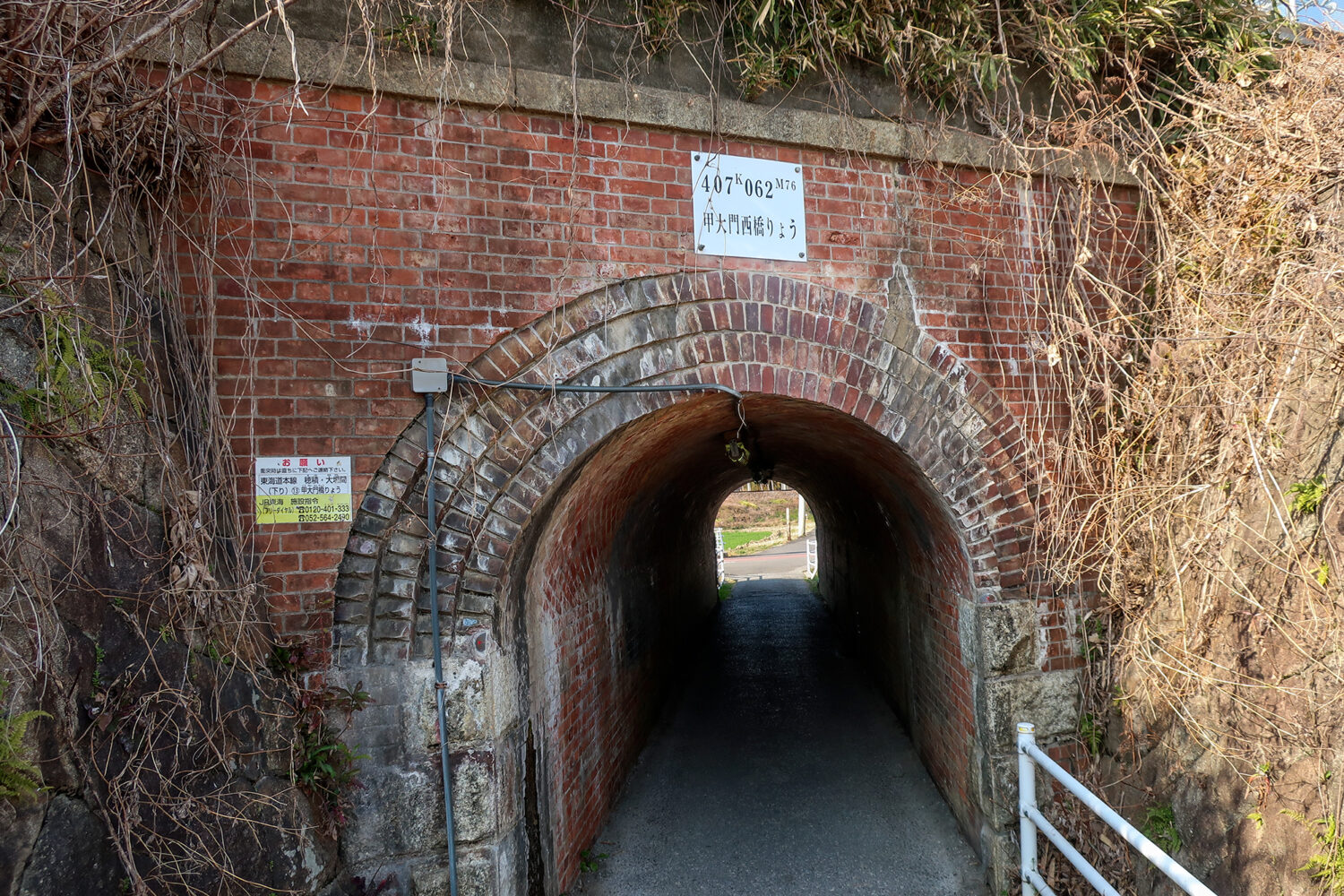 ちなみに、甲大門西橋梁の西にもレンガトンネルがある。おそらく同時期に造られたものだが、こちらは線路と直角に交差しているので、ねじれてはいない。