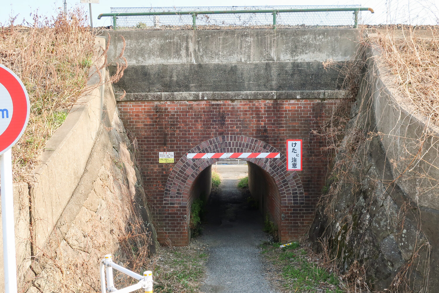 2本目のねじりまんぽは、樽見鉄道の東大垣駅(岐阜県大垣市)の少し東にある。完成したのは琵琶湖疎水とほぼ同時期の1887年(明治20年)。甲大門西橋梁はいまも東海道本線の下を歩行者が通る現役のトンネルだ。