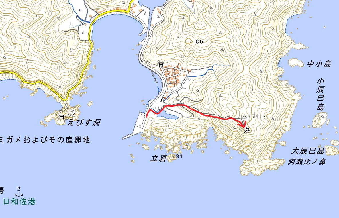 クエストのスタートは、美波町日和佐の街中からクルマで5分ほど、恵比須浜と呼ばれる一帯の港だ。灯台まで歩いた経路を以下に示す。海抜ゼロメートルから150m以上の高低差を700mぐらいの水平距離でのぼらなくてはならない。