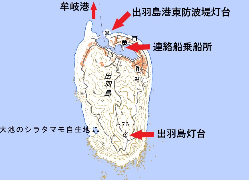 15分で出羽島に到着。灯台へは、港をぐるっと回った反対側(写真の中央付近)から行く。