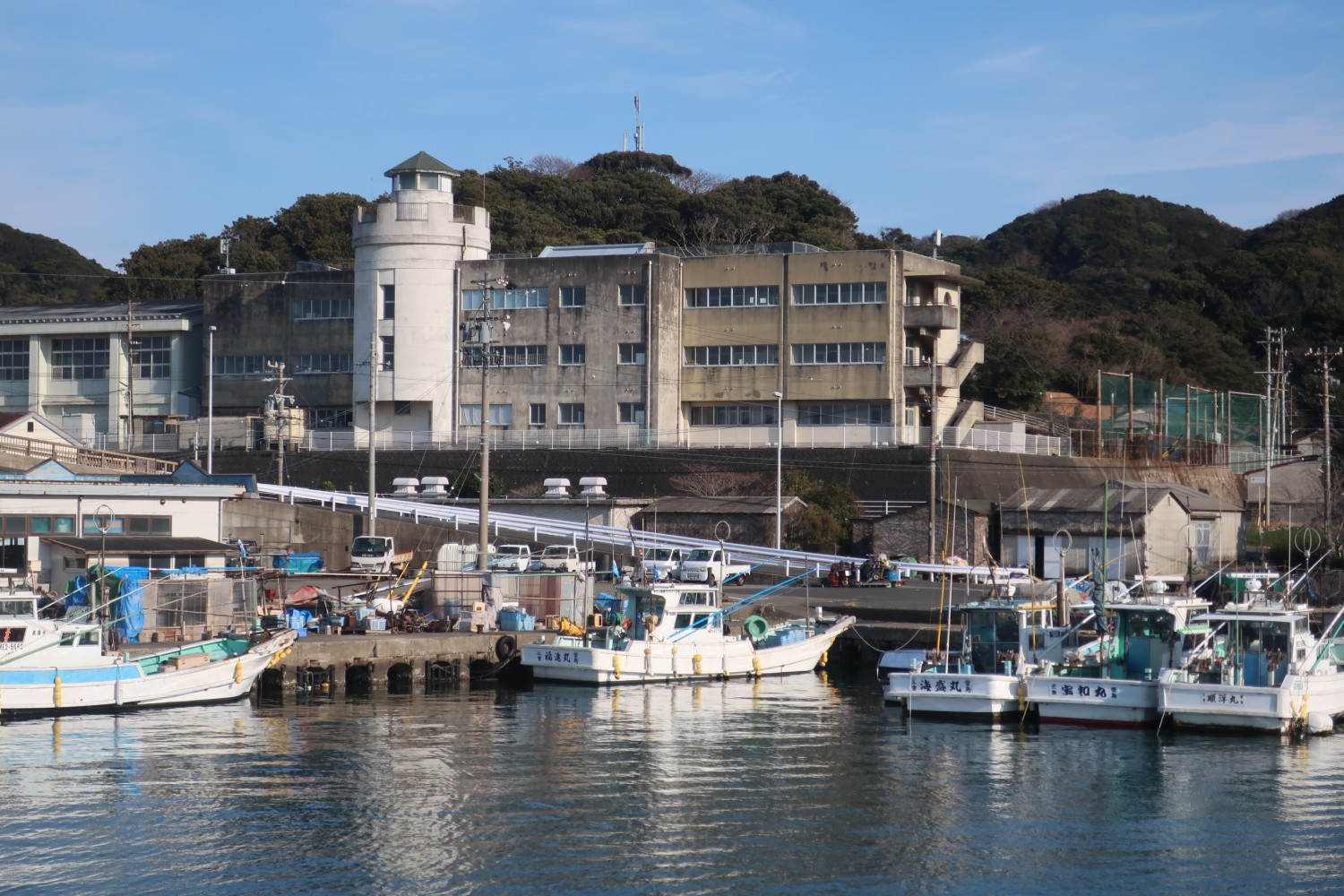15分弱で菅島に到着。大きな存在感を持つ、港の正面の建物は菅島小学校だ(別の日に撮影した写真なので天気が違う)。校舎の中央に、菅島灯台を模した塔がある。灯台が島のシンボルになっているということか。