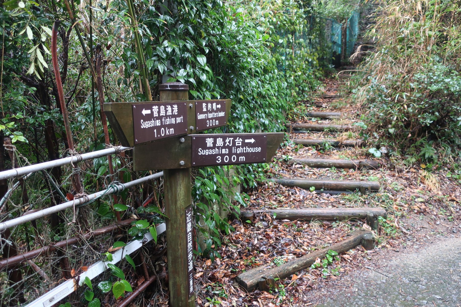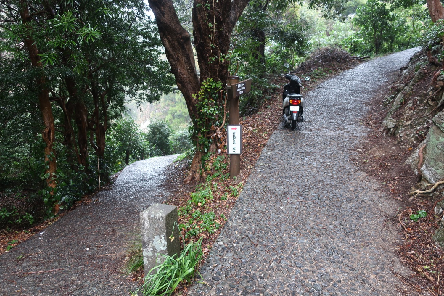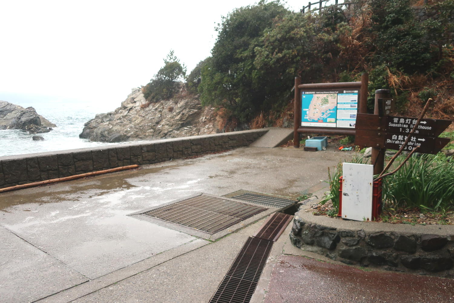 船を降りて上下のレインウェア(カッパ)を着込む。港から左方向に向かって、この植え込みの向こう側を左に曲がる。