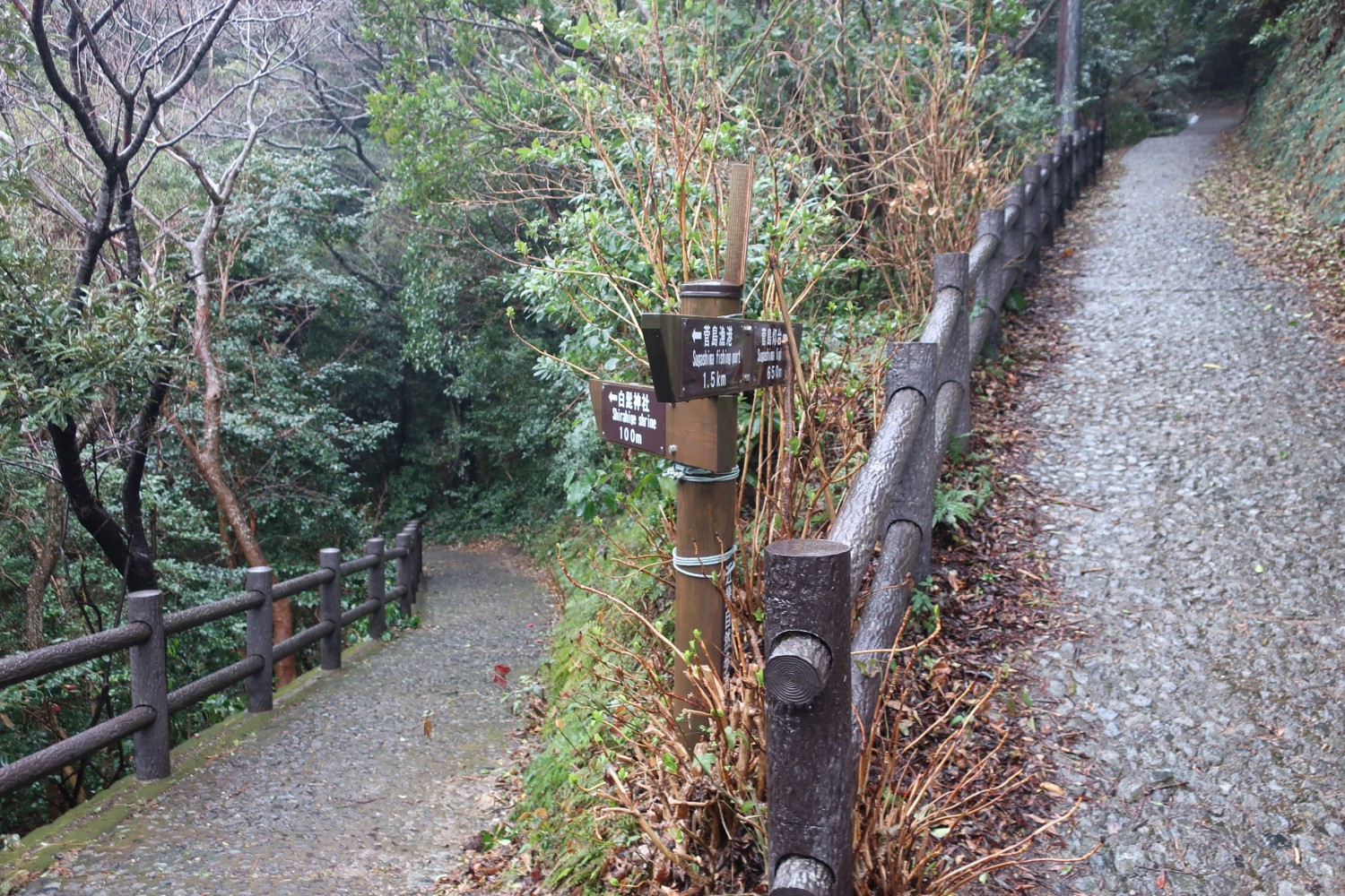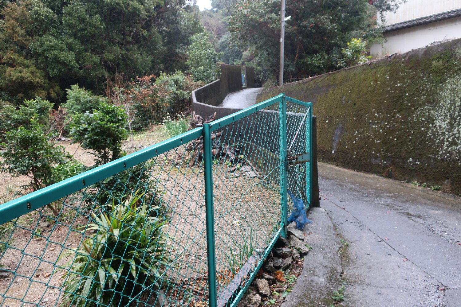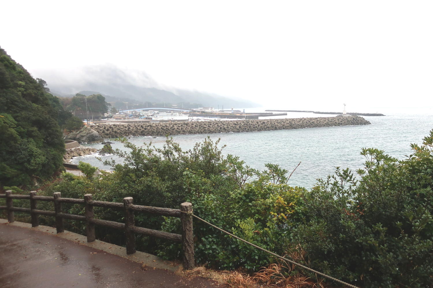 船を降りて上下のレインウェア(カッパ)を着込む。港から左方向に向かって、この植え込みの向こう側を左に曲がる。