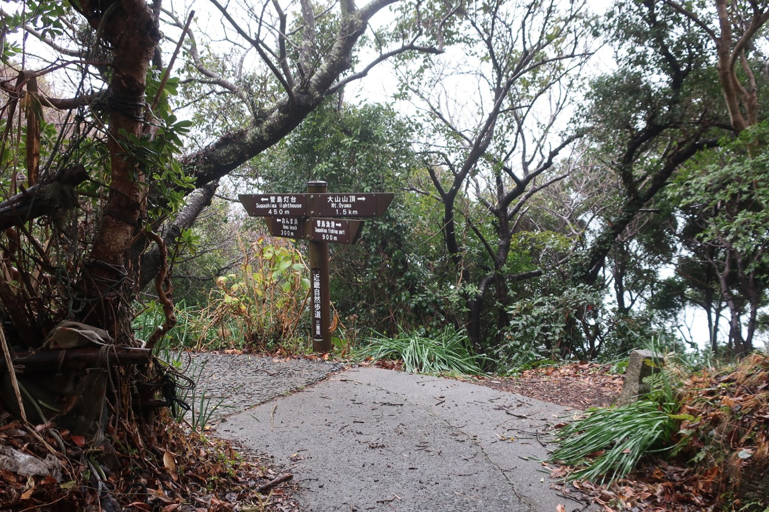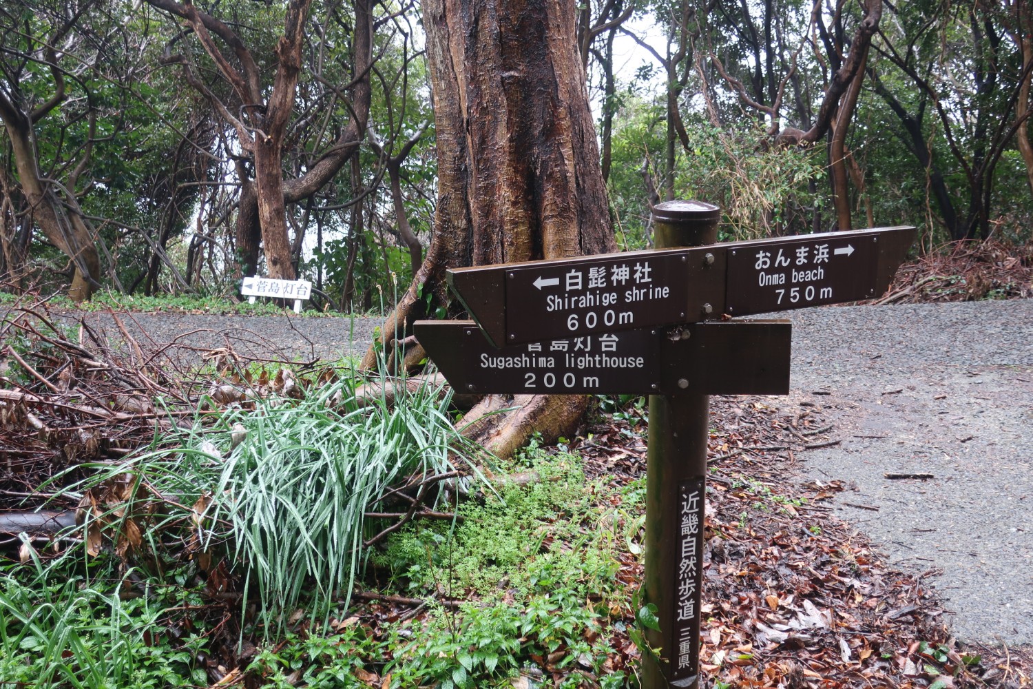 左に「菅島灯台」と書かれているので迷いはない。ただ、「おんま浜」が指すような、左斜め前に向かう道っぽいものはないように見える。今来た道の行き先は「菅島漁港」。