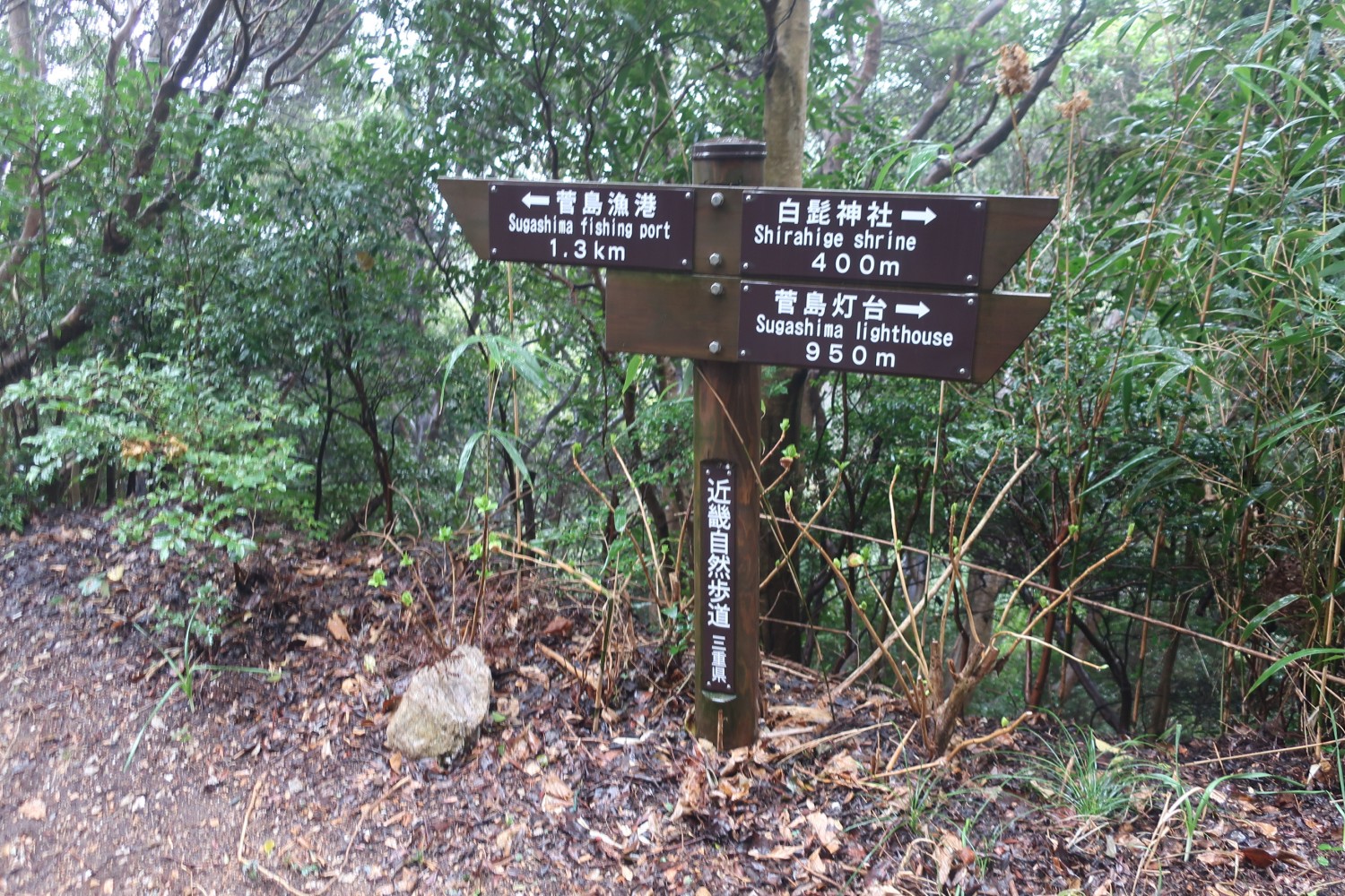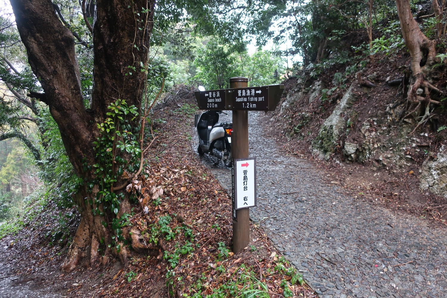 これまで白鬚神社を目指してきたので、「白鬚神社 100m」が指す左下に向かいそうになるが、そうではない。「菅島漁港 1.5km」が指す後ろ方向の道に行くべきなのだ。