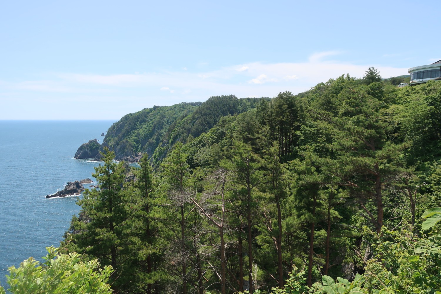 そのベンチからはこういう眺めだ。この先が、雄大な断崖が見どころの景勝地、北山崎だ。写真右端に国民宿舎の展望食堂と思われる建物が見える。