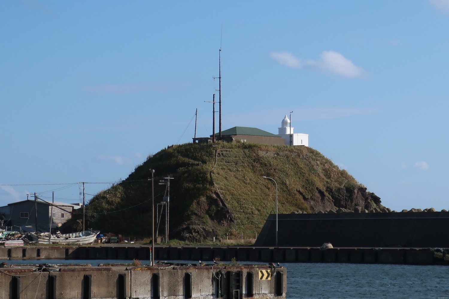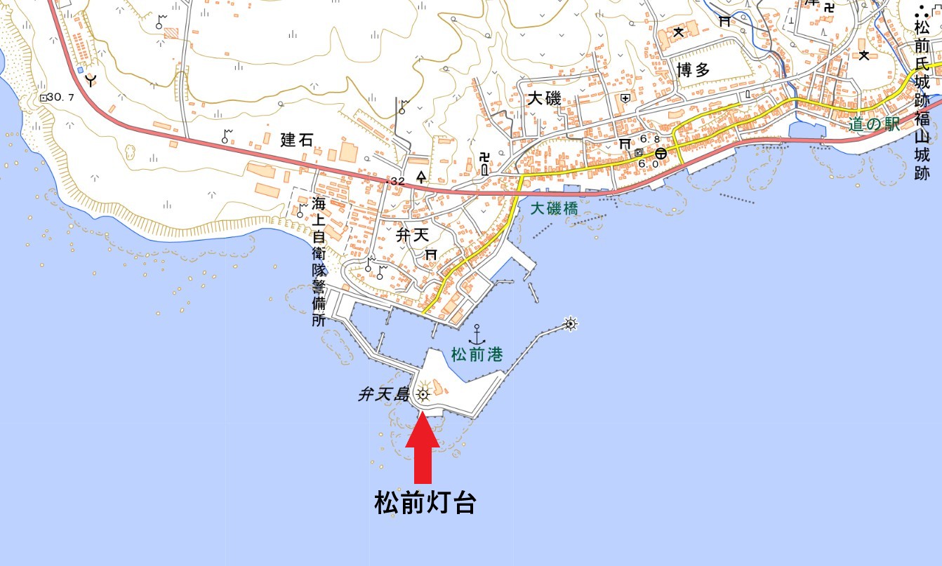 松前灯台が立っているのは弁天島という島だが、防波堤でつながり、周囲は埋め立てられているから、実質的には高さ20mぐらいの小高い山と言える。そのため、まん前までクルマで行くことができる。
