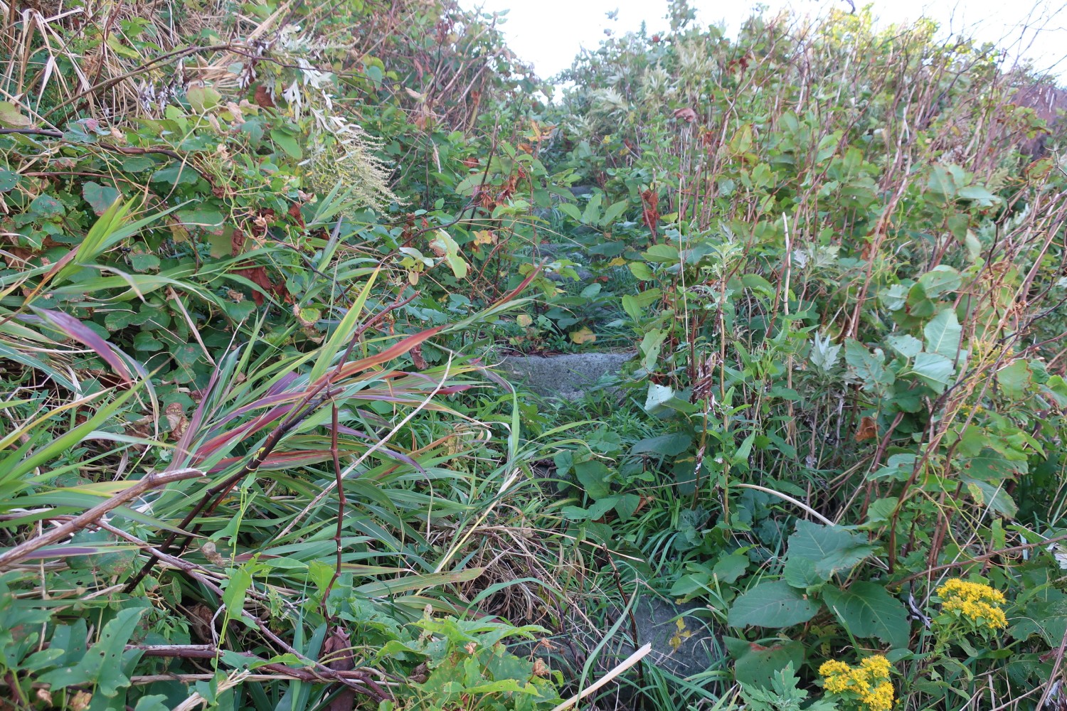 足元に四角柱の石がいくつか横たわっていた。この石で階段にしていたんだろう。草でよく見えないのだが、くずれてすでにちゃんとした階段ではなくなっているようだ。