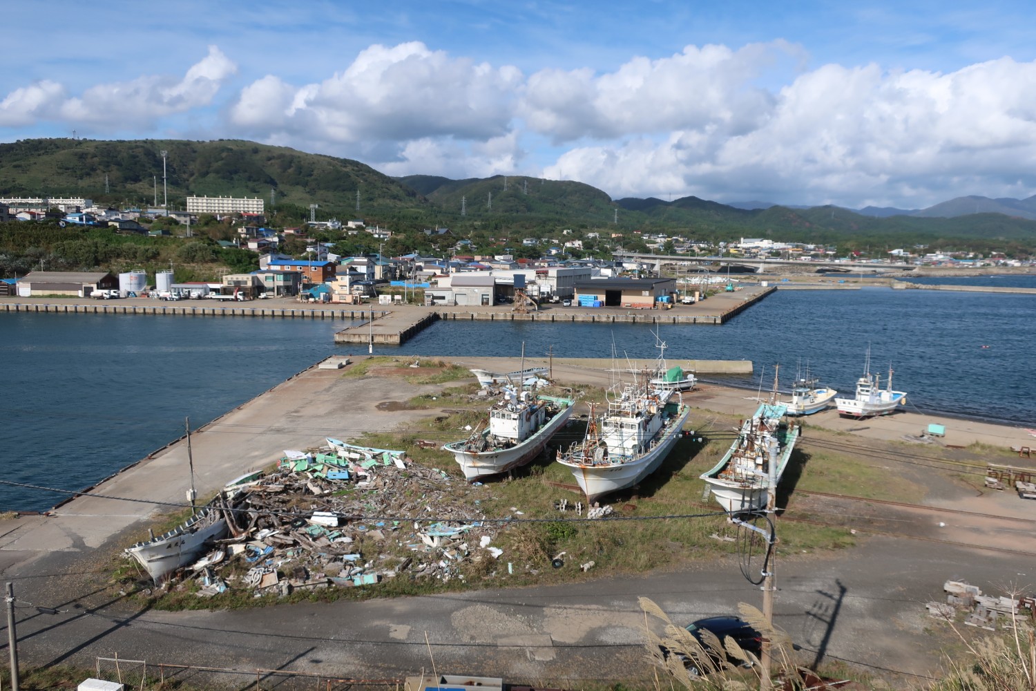 右手を見ると、正面に松前の中心街が見えた。江戸時代、松前藩の城下町だったところだと思う。