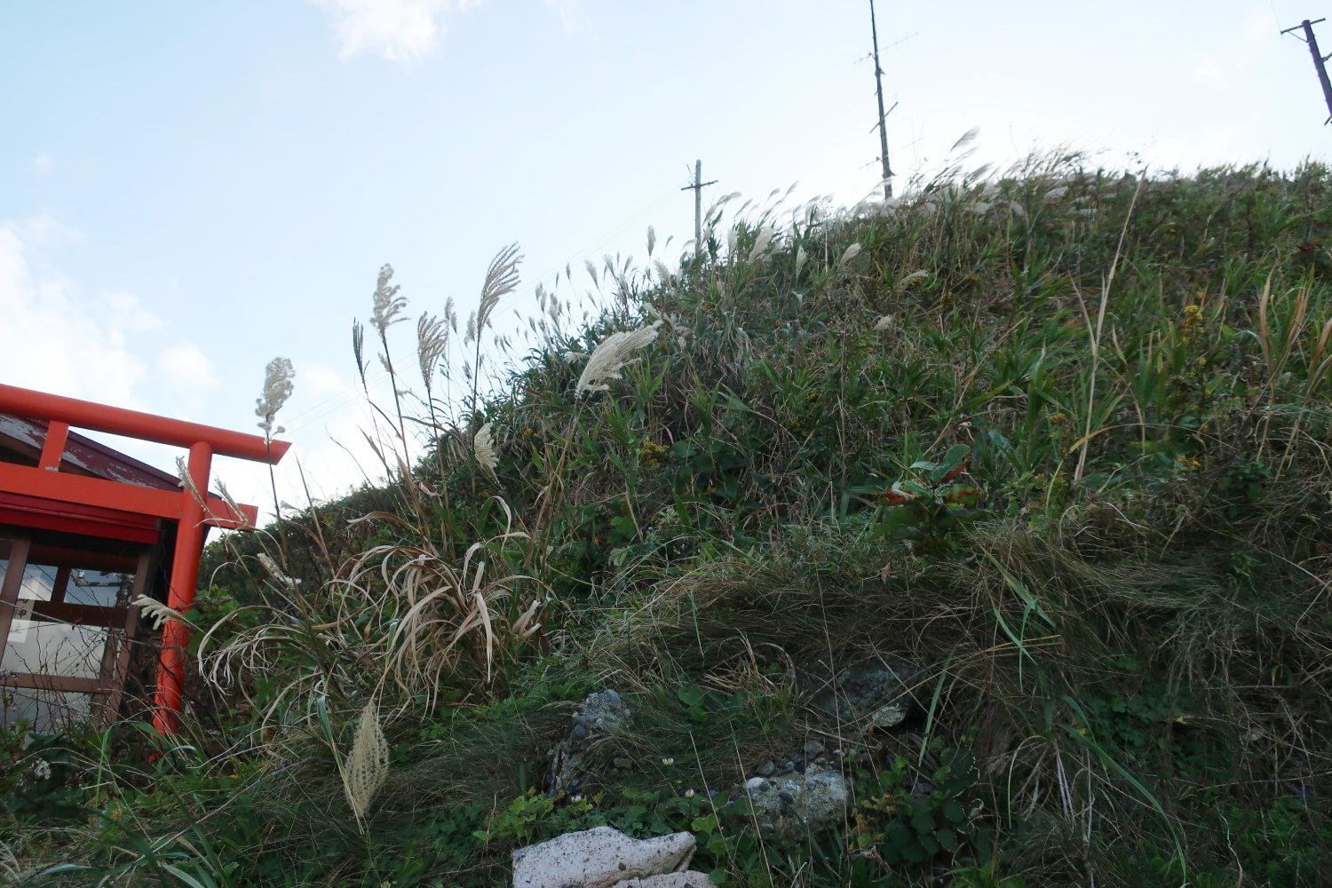この先で左に180度折り返して、石垣の上側にのぼると、頂上に着いた。のぼり始めてから5分にすぎないのだが、かなり緊張を強いられた。コンクリートの門柱があったのだが、後ろに下がれないのでうまく写真を撮れなかった。