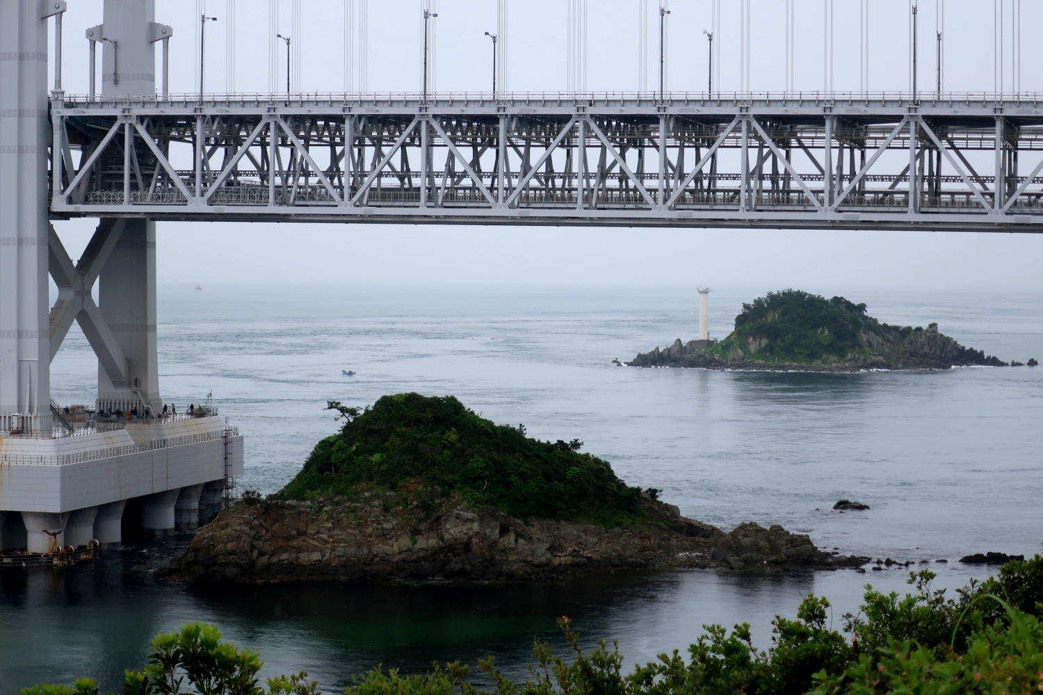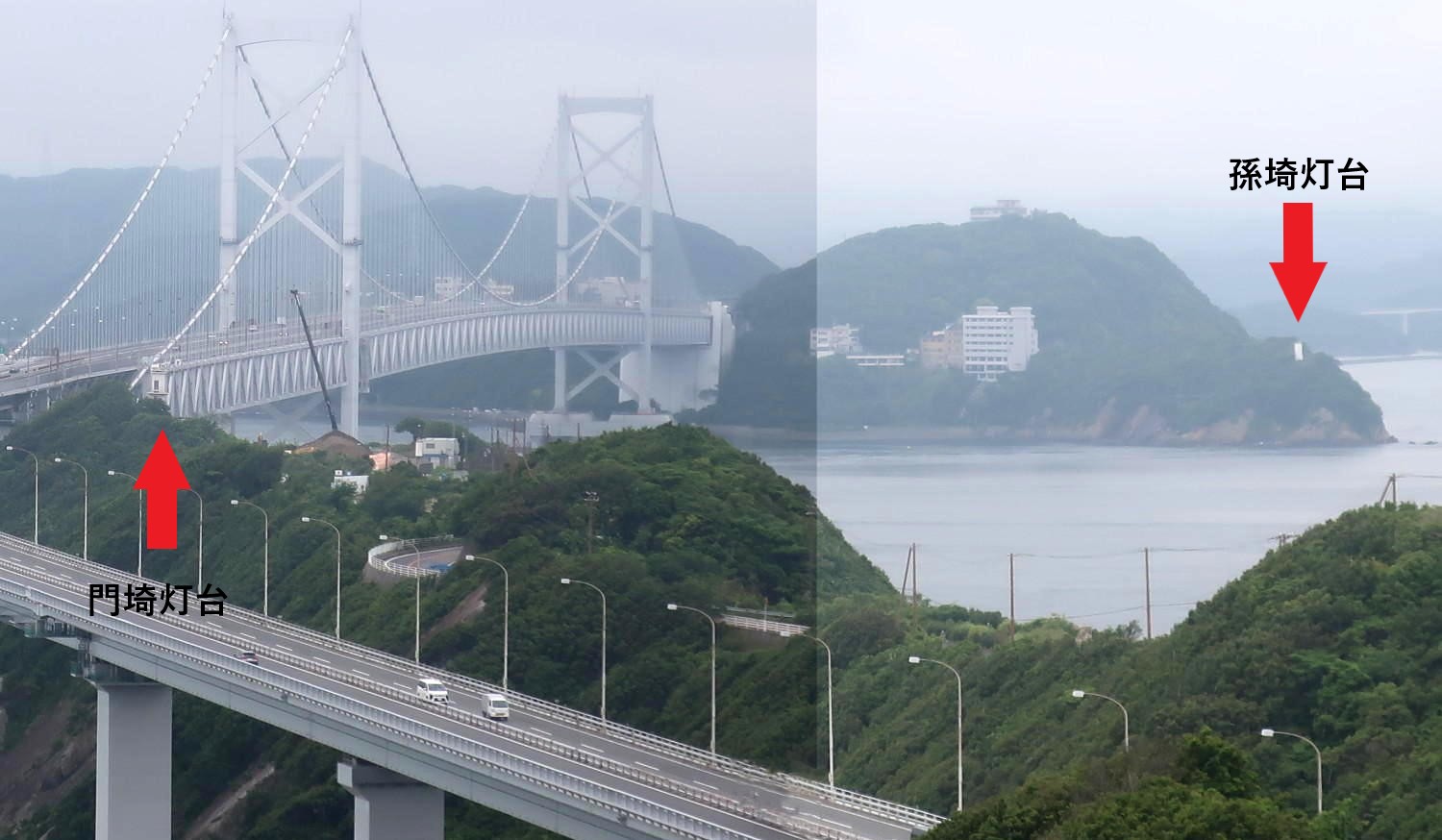 両灯台の直線距離は1.3kmと近い。次の画像は淡路島側から、2つの灯台と、鳴門海峡、大鳴門橋(神戸淡路鳴門自動車道)を見たもの。2枚の写真を重ねているうえに、小雨がぱらつく天気のためにかすんでいるのだが、それぞれの位置関係はだいたいつかめると思う。