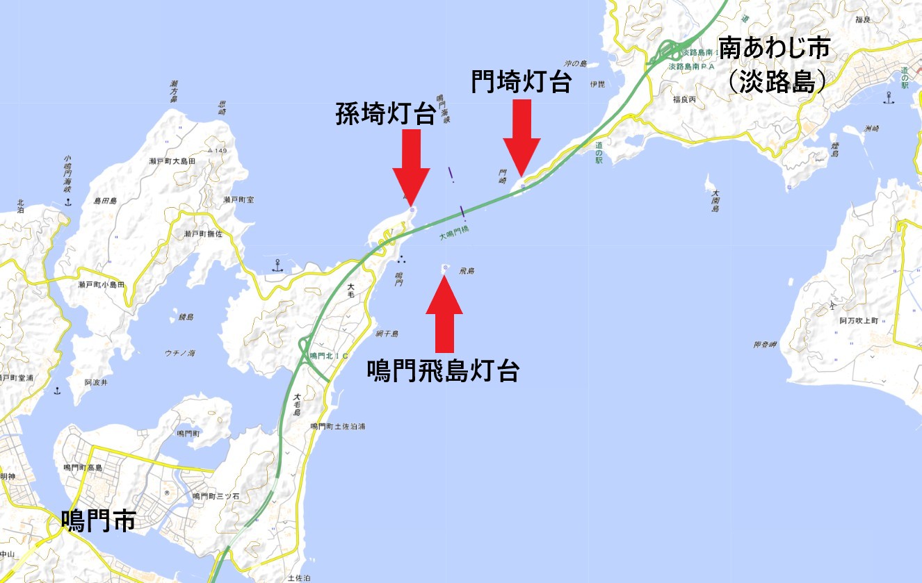 鳴門海峡は瀬戸内海の要衝ではあるが、初点灯は門埼灯台が1964年(昭和39年)3月、孫埼灯台が1951年(昭和26年)と、灯台としては思いのほか新しい。多くの船は明石海峡を通り、鳴門海峡を通る船が少ないからだろうか。