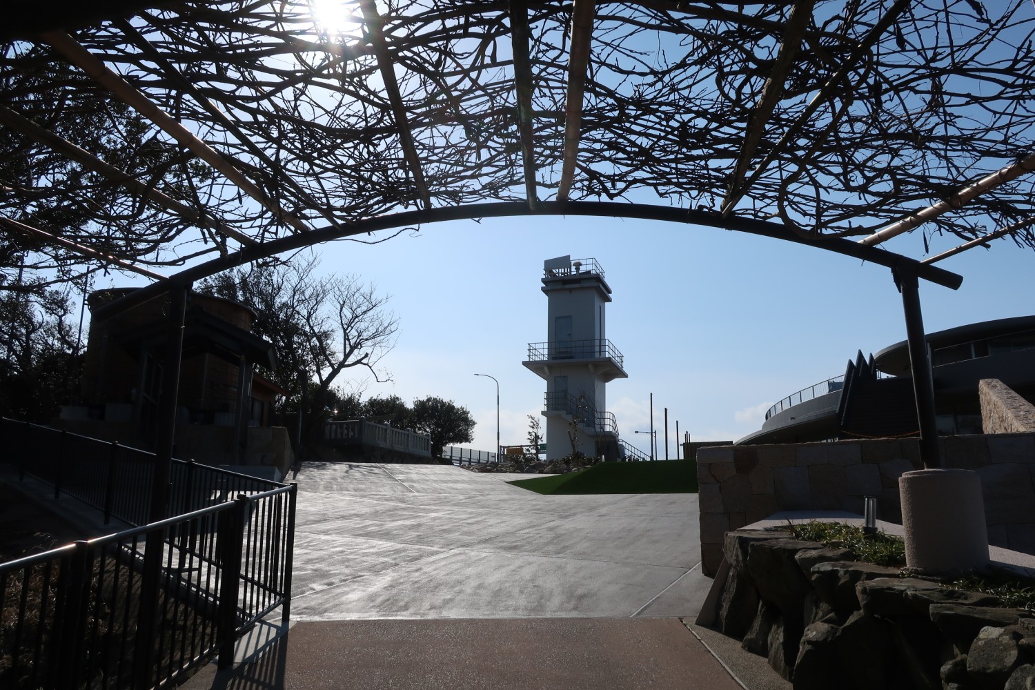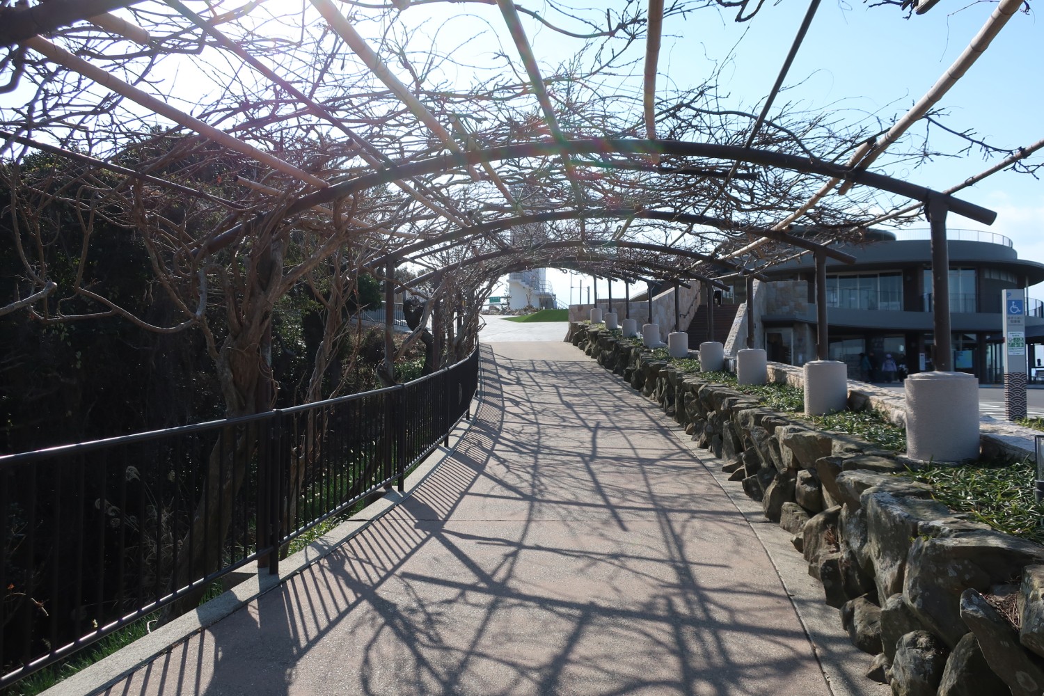 というわけで、道の駅がリニューアルオープンしたあと、再挑戦した。このトンネルは藤だろうか? 花の時期は灯台へのアプローチとしてとてもよさそうだ。以前からあったのか、今回新設されたのか。