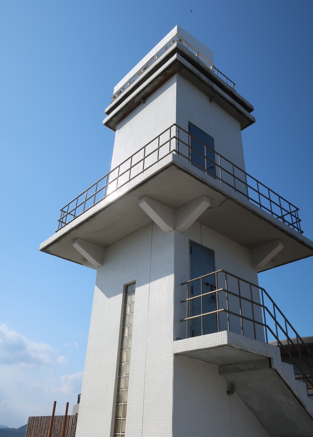 階段をのぼったところのドアが入口だが、銘板がどこにも見当たらない。その1階上に回廊があるが、灯光はもっと上だ。建物はどこまでも角張っているし、多くの灯台とはだいぶ違った設計だ。