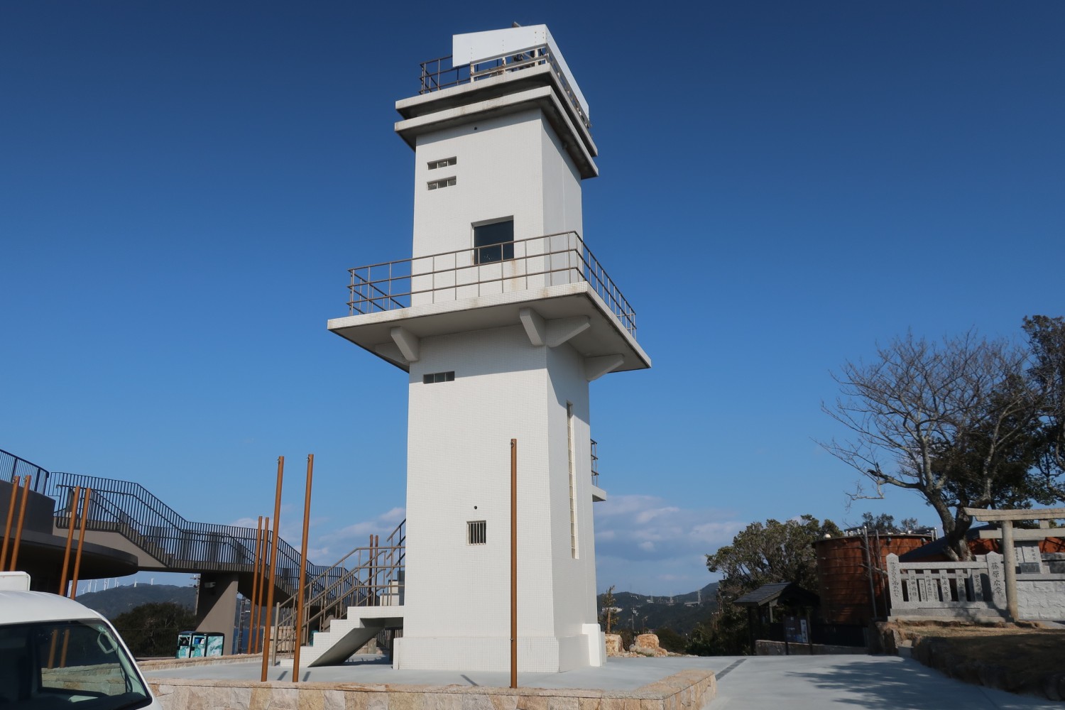 現在の灯台は2018年(平成30年)11月に改築されたもので、それ以前は門埼灯台と同じような角張った形だった。海峡を挟んで似た形の灯台がある、というのもいいものだと思うので、角柱形のままにしてほしかったな。