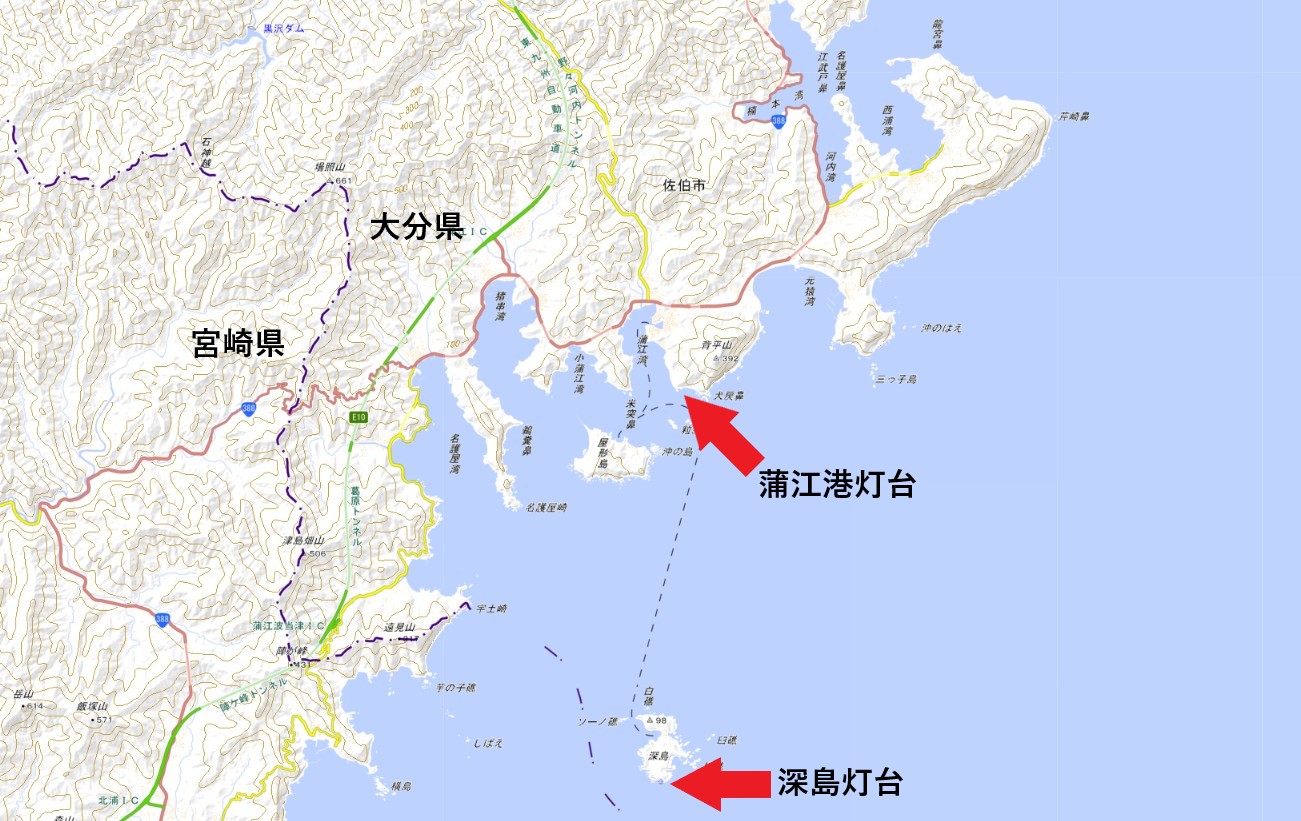 蒲江港灯台があるのは大分県の南部、宮崎県との県境に近いところ。複雑な海岸線で、いくつか漁港もあるのだが、ほかには深島灯台ぐらいしかない(防波堤灯台、消波堤灯台、灯浮標などを除く)。なぜだろう。