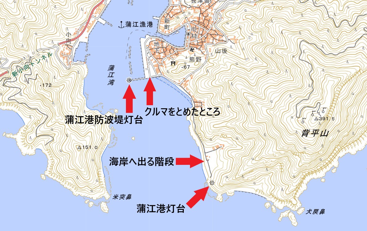 帰宅後改めて地図を見てみると、階段をおりて海岸に出ずに、細道を進むと灯台近くに出るように道が描かれている。