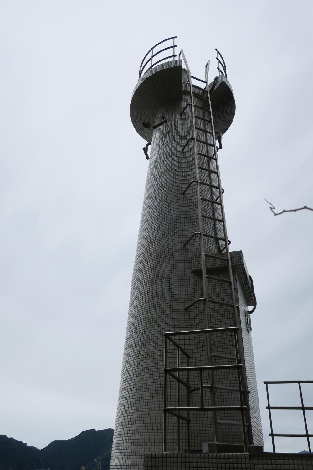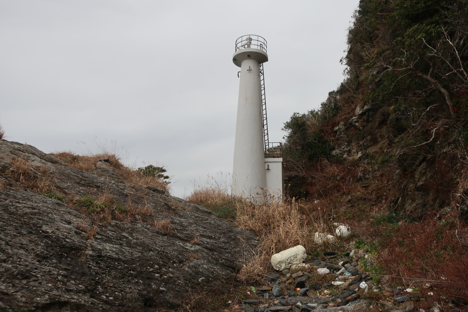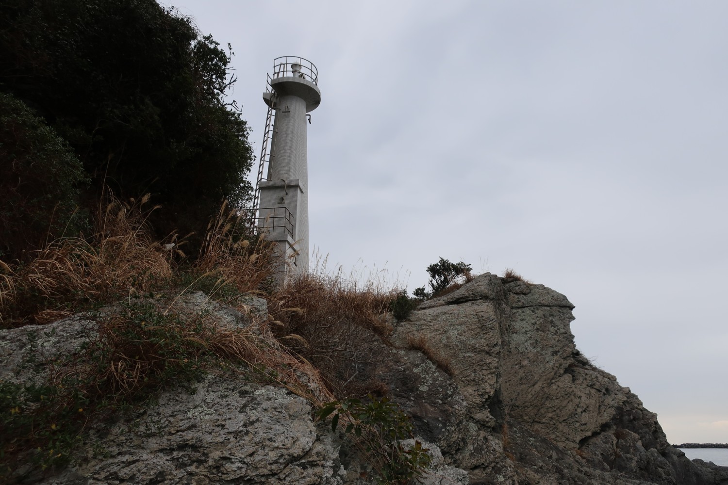 足に草を引っかけてころばないようにしながら、ようやく灯台の足元に到着。港の公園から岩登りを含めて20分ぐらい。初点灯は1951年(昭和26年)1月で、1981年(昭和56年)3月に改築されている。