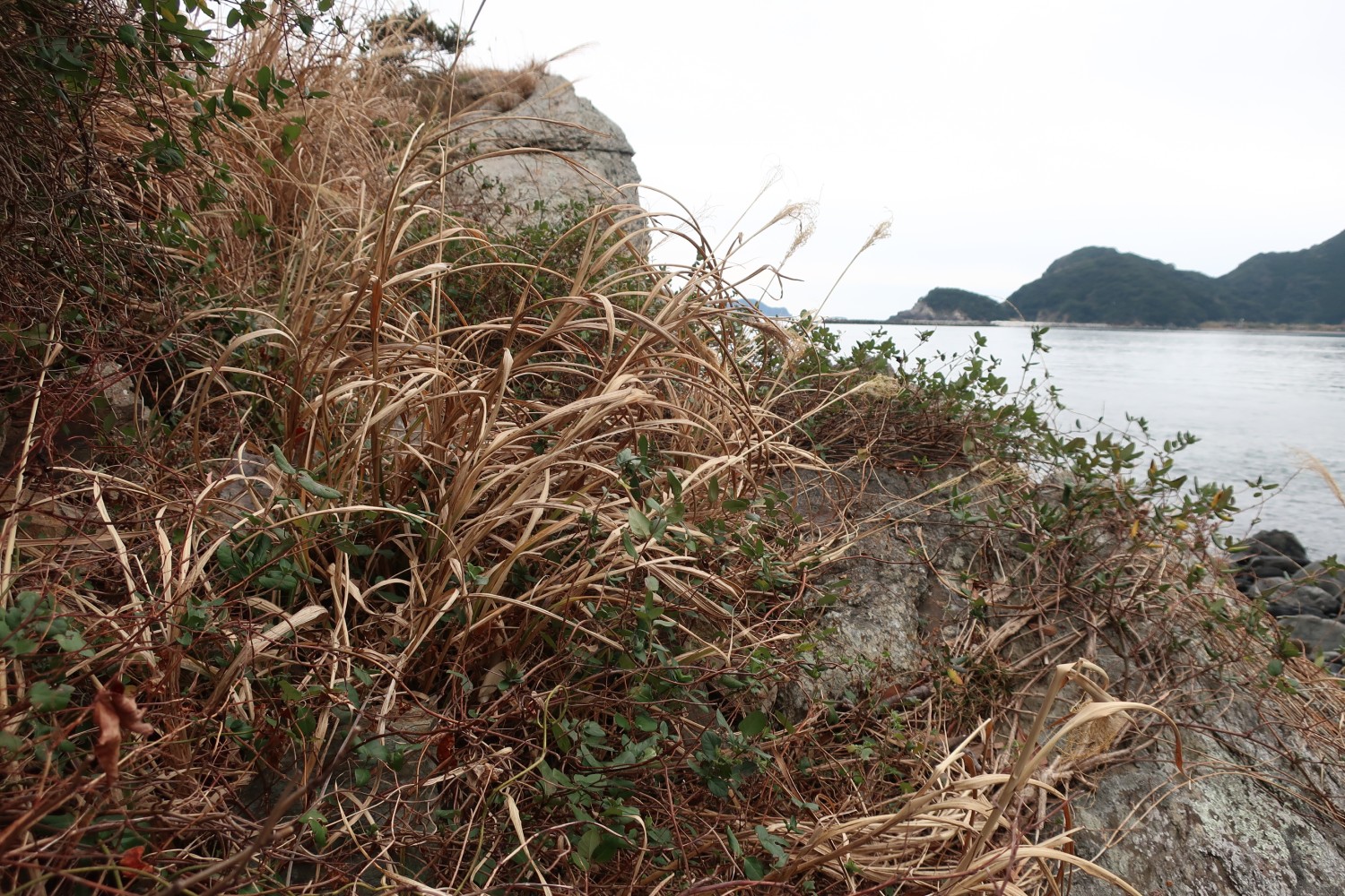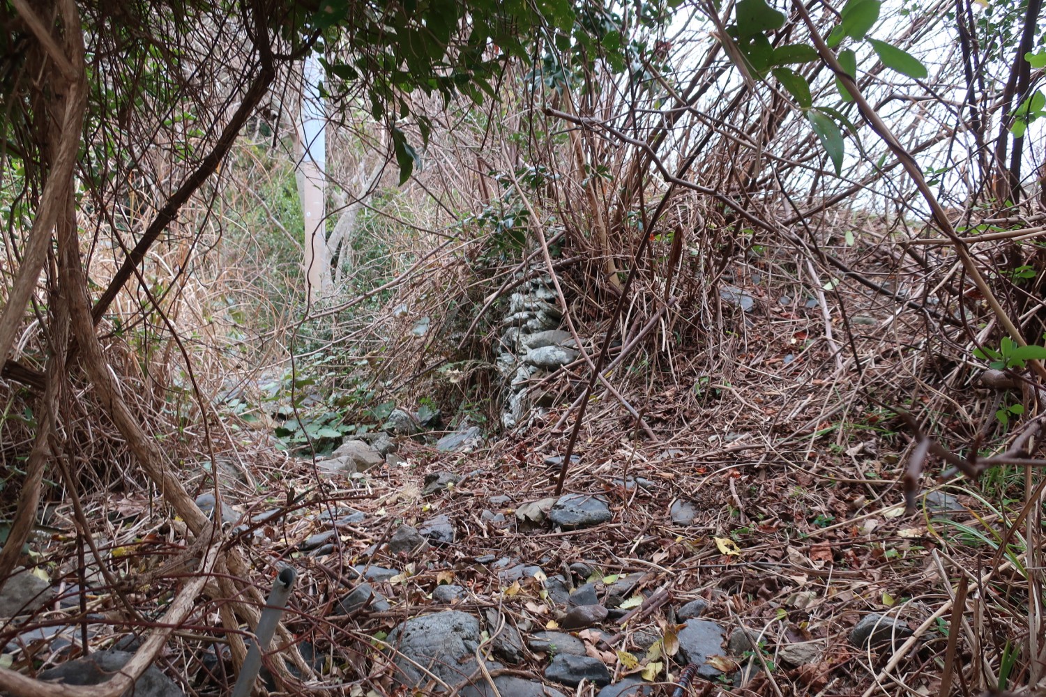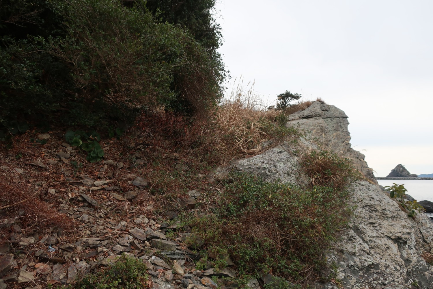 用途不明の石垣は灯台近くまであった。右方向に石垣を越えると海岸に出てしまうだろう。しかし左はもう進めなさそうだ。
