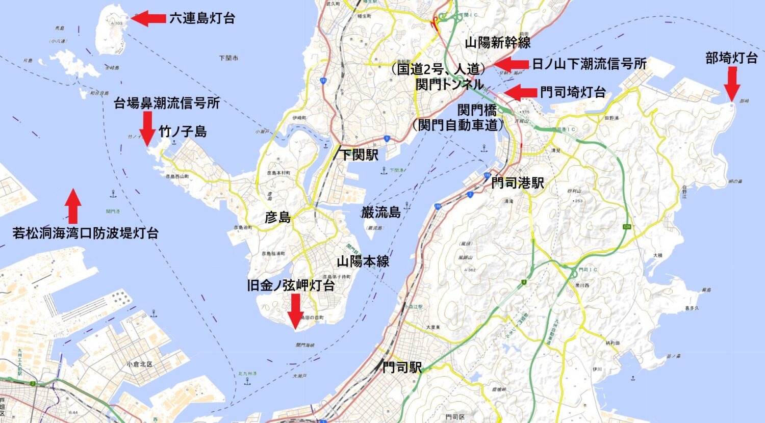 一般的に関門海峡は、部埼灯台(へさきとうだい、福岡県北九州市)のある部埼から、六連島灯台(むつれじまとうだい、山口県下関市)のある六連島あたりまでを指すことが多いようだ。