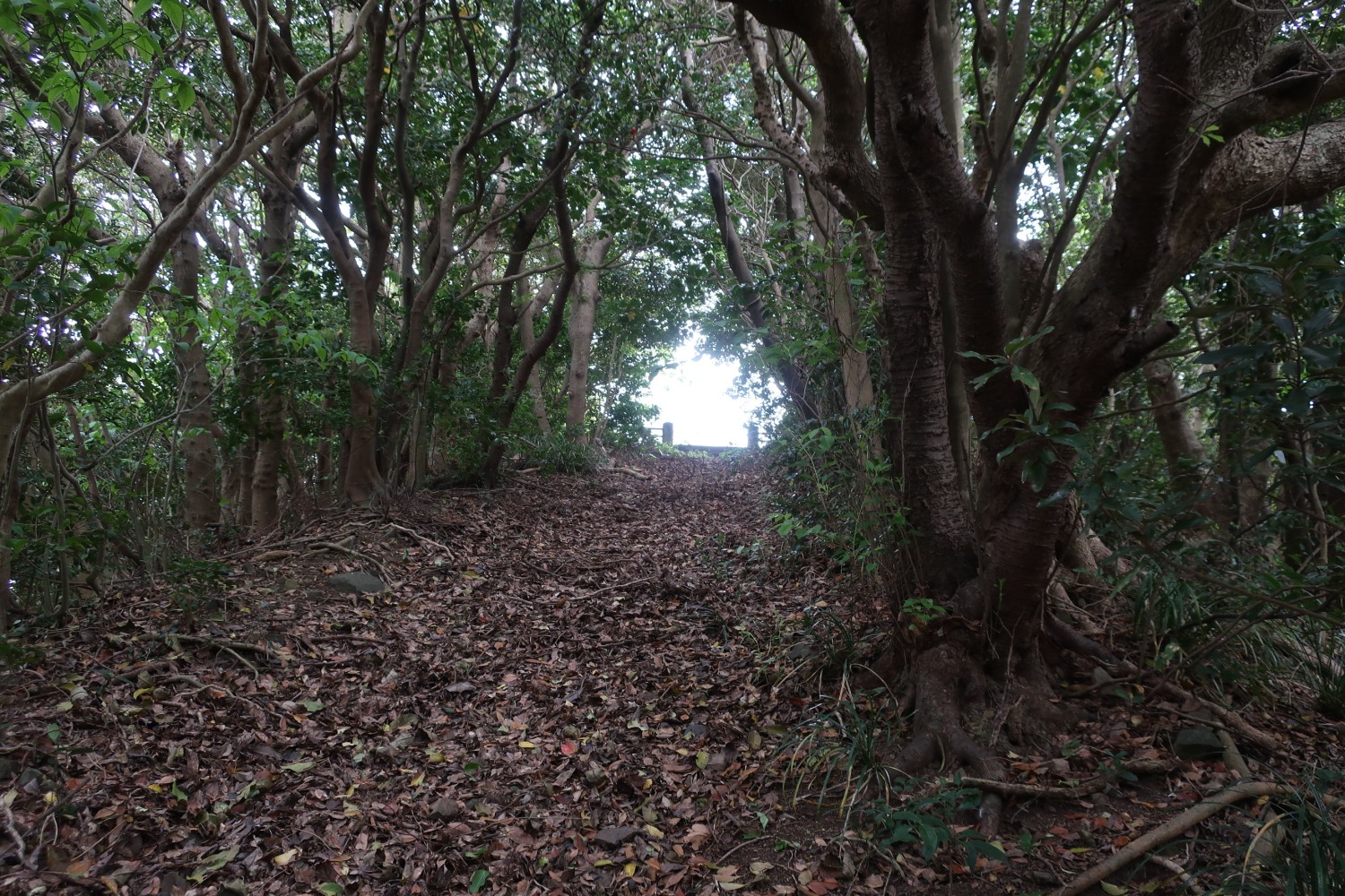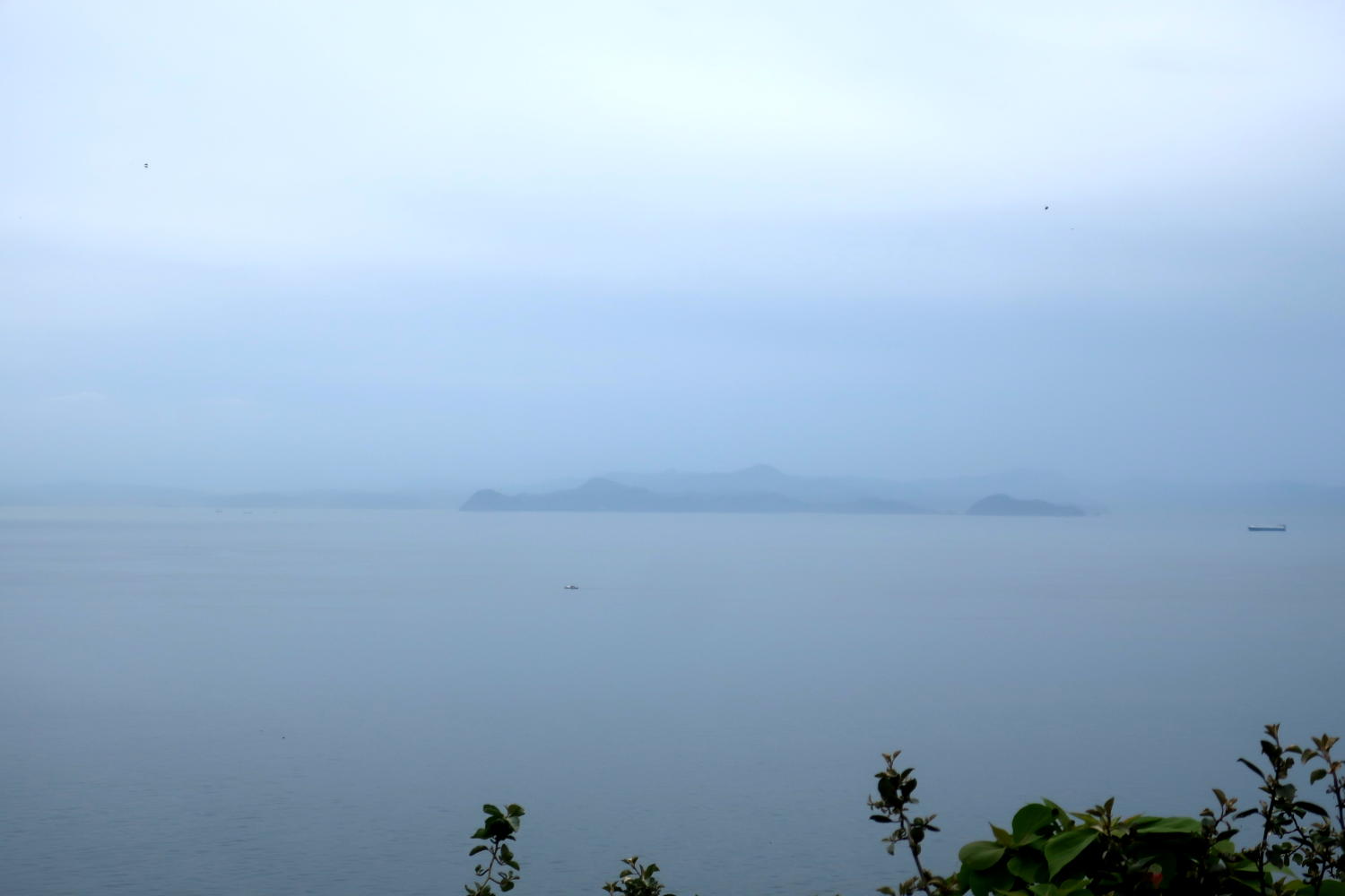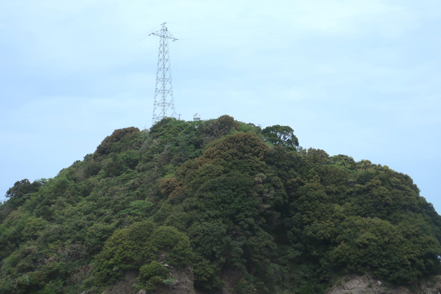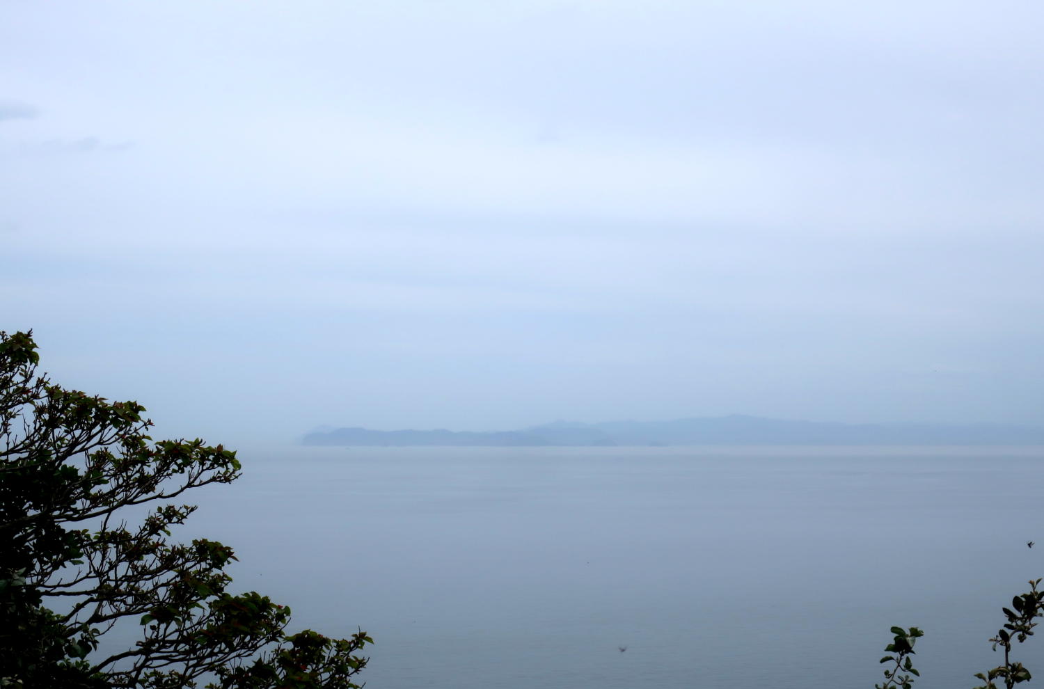 木立の間から海が見える。今ひとつの天気なので、ぼんやりとしているのだが、これは大分県津久見市と佐伯市にまたがる四浦半島ではないだろうか。とするとどこかに高甲岩灯台(たかごいわ/たかごういわとうだい)があるはず。