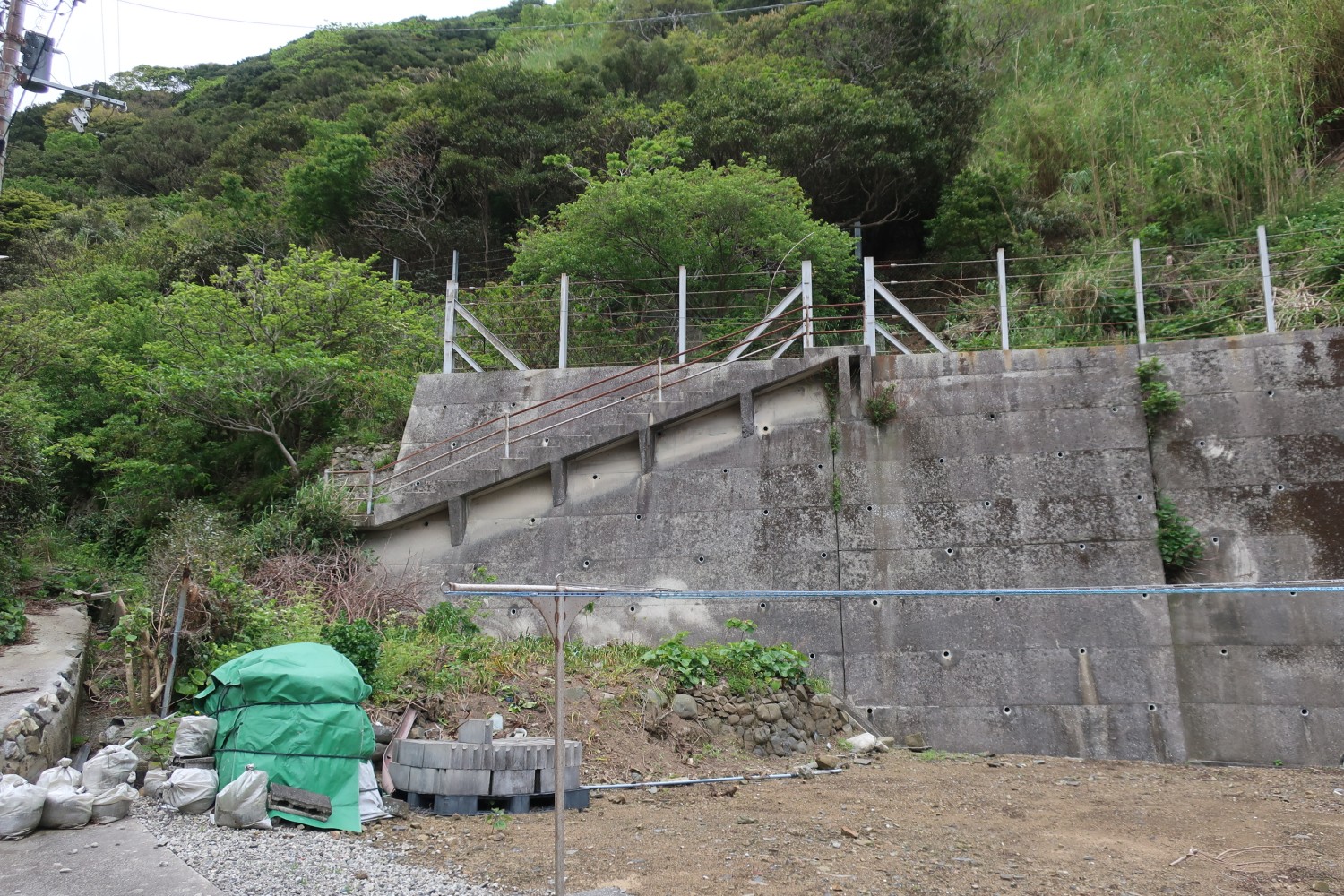 民家が終わったところに擁壁をのぼる階段がある。左端の排水溝をまたいで階段にたどり着く。