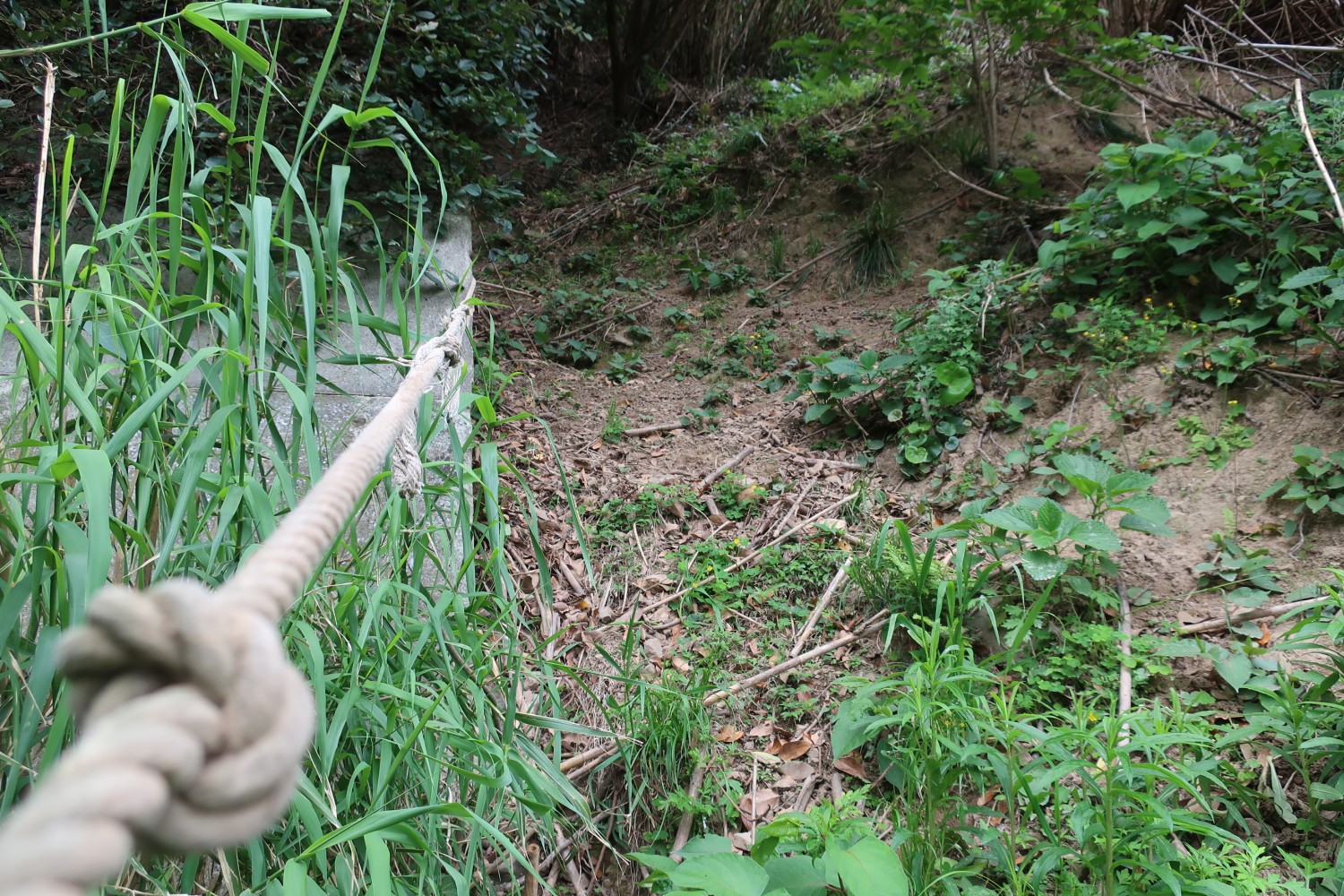 階段をのぼって柵の間を抜けるといきなり崖だ。傾斜がきついので、ロープにつかまってのぼるしかない。